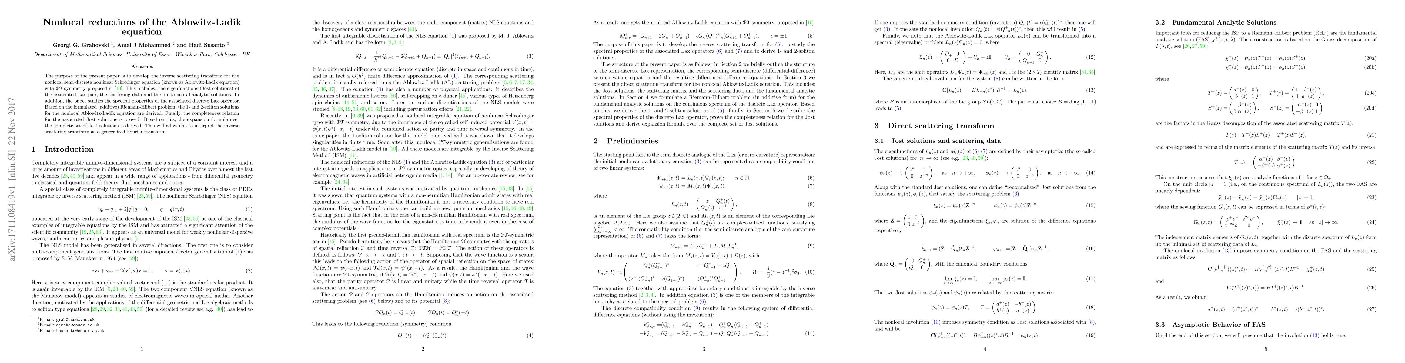 This paper develops the inverse scattering transform for the nonlocal Ablowitz-Ladik equation, focusing on PT-symmetric cases. It derives 1- and 2-soliton solutions and proves the completeness relation for Jost solutions, interpreting the transform as a generalized Fourier transform.
