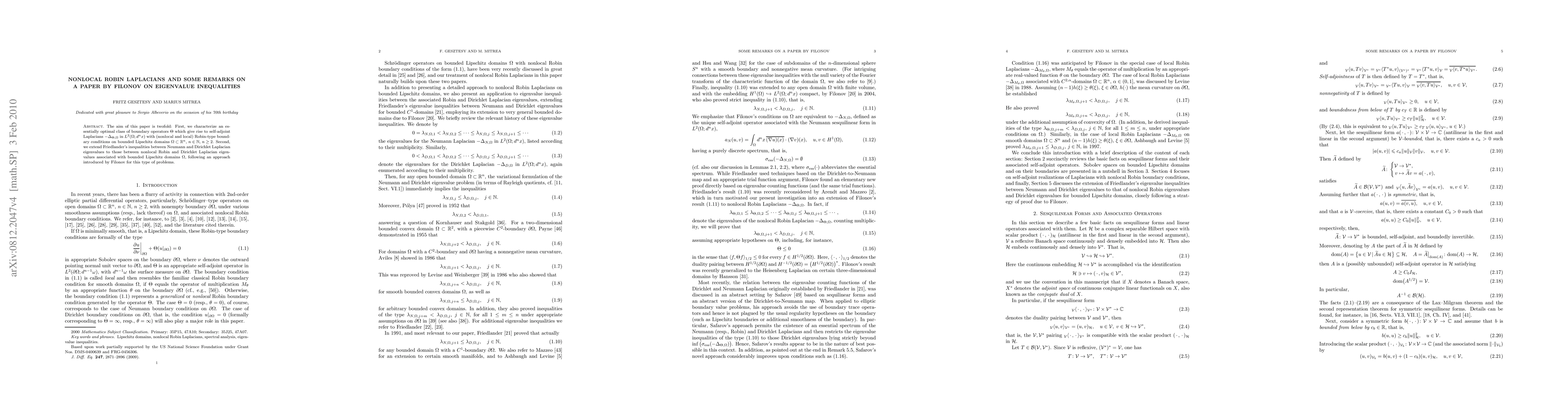 This paper characterizes optimal boundary operators for self-adjoint Laplacians with Robin-type conditions in $L^2(\Omega)$ and extends Friedlander's eigenvalue inequalities to nonlocal Robin Laplacians, building on Filonov's work.