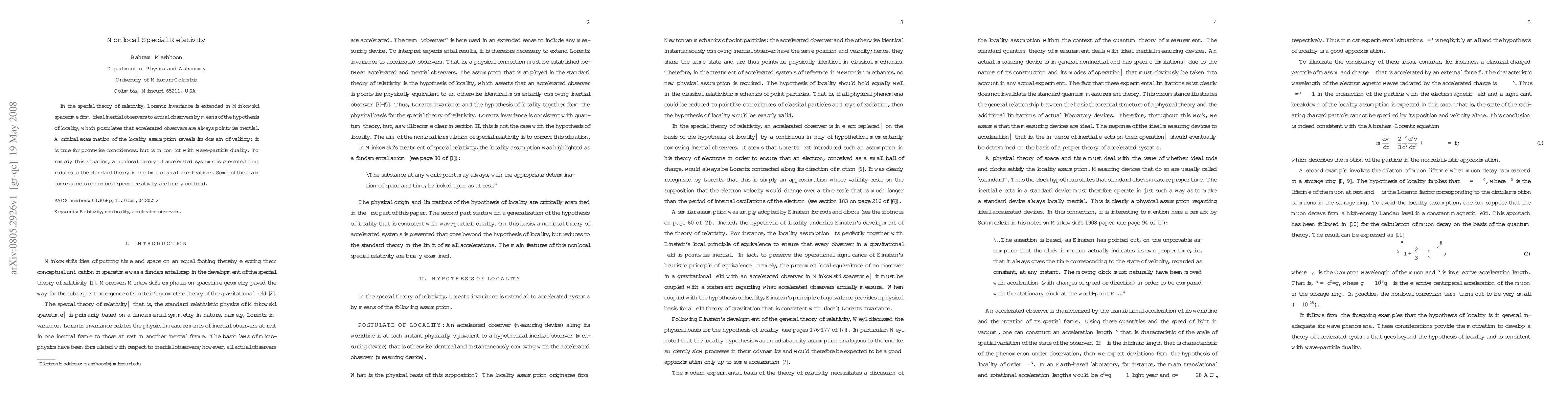 In the special theory of relativity, Lorentz invariance is extended in Minkowski spacetime from ideal inertial observers to actual observers by means of the hypothesis of locality, which postulates that accelerated observers are always pointwise inertial. A critical examination of the locality assumption reveals its domain of validity: it is true for pointwise coincidences, but is in conflict with wave-particle duality. To remedy this situation, a nonlocal theory of accelerated systems is presented that reduces to the standard theory in the limit of small accelerations. Some of the main consequences of nonlocal special relativity are briefly outlined.