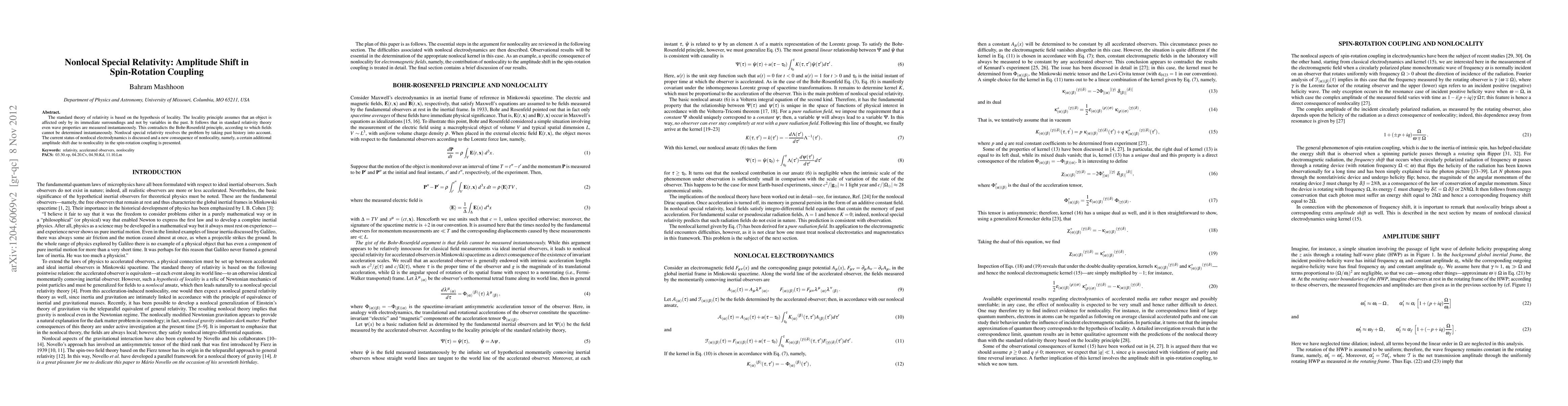 The standard theory of relativity is based on the hypothesis of locality. The locality principle assumes that an object is affected only by its immediate surroundings and not by variables in the past. It follows that in standard relativity theory even wave properties are measured instantaneously. This contradicts the Bohr-Rosenfeld principle, according to which fields cannot be determined instantaneously. Nonlocal special relativity resolves the problem by taking past history into account. The current status of nonlocal electrodynamics is discussed and a new consequence of nonlocality, namely, a certain additional amplitude shift due to nonlocality in the spin-rotation coupling is presented.
