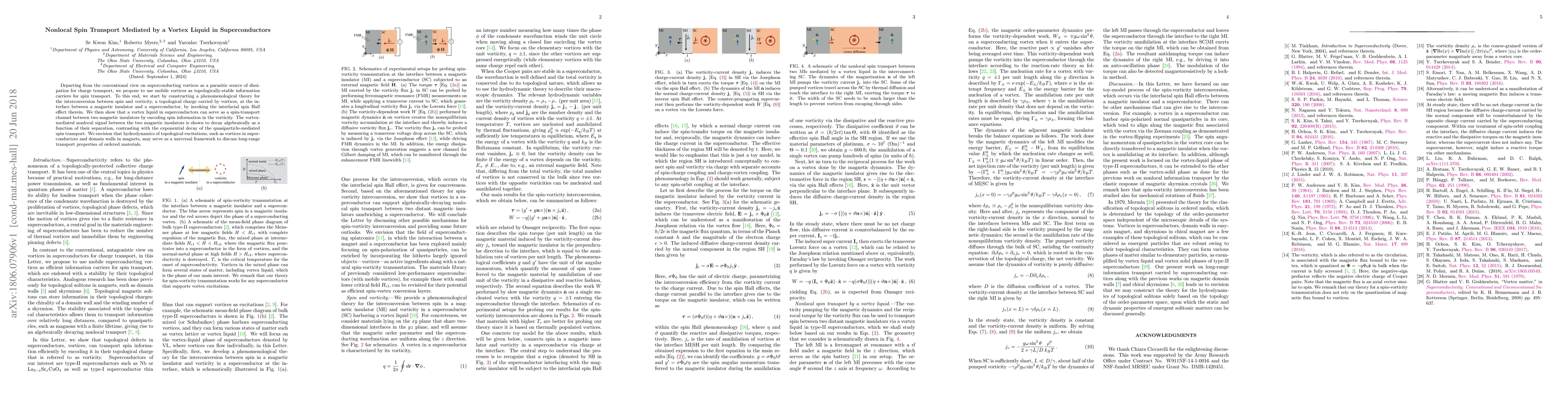 Departing from the conventional view on superconducting vortices as a parasitic source of dissipation for charge transport, we propose to use mobile vortices as topologically-stable information carriers for spin transport. To this end, we start by constructing a phenomenological theory for the interconversion between spin and vorticity, a topological charge carried by vortices, at the interface between a magnetic insulator and a superconductor, by invoking the interfacial spin Hall effect therein. We then show that a vortex liquid in superconductors can serve as a spin-transport channel between two magnetic insulators by encoding spin information in the vorticity. The vortex-mediated nonlocal signal between the two magnetic insulators is shown to decay algebraically as a function of their separation, contrasting with the exponential decay of the quasiparticle-mediated spin transport. We envision that hydrodynamics of topological excitations, such as vortices in superconductors and domain walls in magnets, may serve as a universal framework to discuss long-range transport properties of ordered materials.