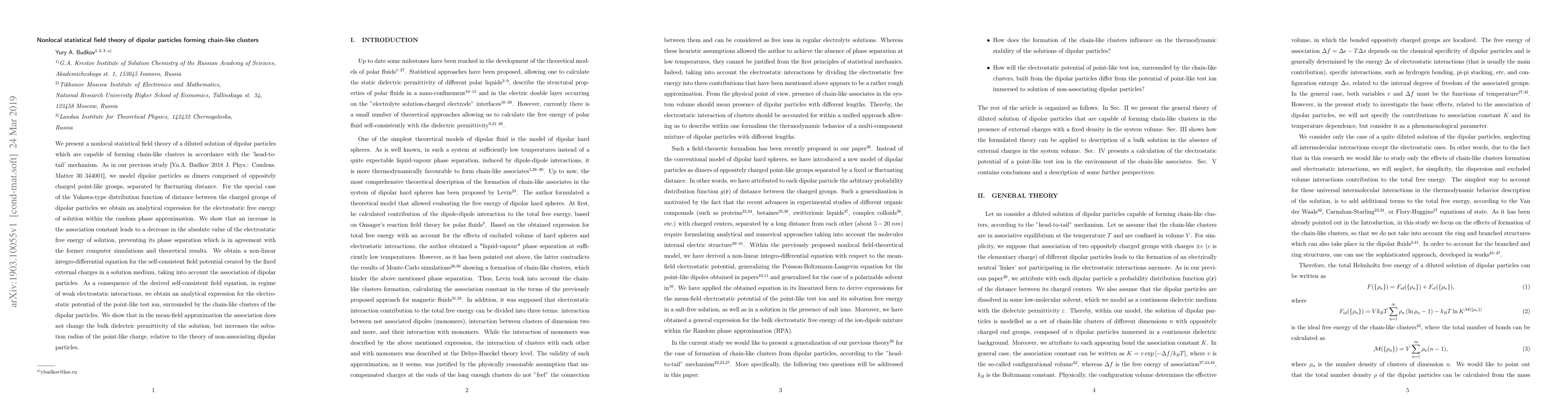 This paper develops a nonlocal statistical field theory for dipolar particles forming chain-like clusters, deriving an analytical expression for the electrostatic free energy and a self-consistent field equation. The study shows that increased association constants reduce electrostatic free energy, preventing phase separation, and modifies the solvation radius of test ions.