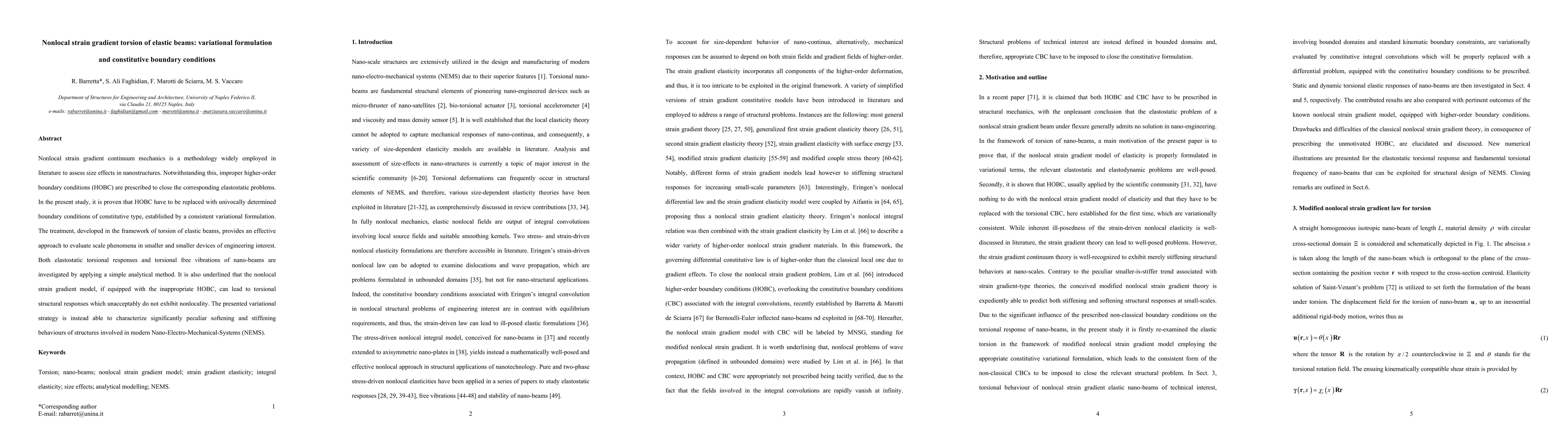 Nonlocal strain gradient continuum mechanics is a methodology widely employed in literature to assess size effects in nanostructures. Notwithstanding this, improper higher-order boundary conditions (HOBC) are prescribed to close the corresponding elastostatic problems. In the present study, it is proven that HOBC have to be replaced with univocally determined boundary conditions of constitutive type, established by a consistent variational formulation. The treatment, developed in the framework of torsion of elastic beams, provides an effective approach to evaluate scale phenomena in smaller and smaller devices of engineering interest. Both elastostatic torsional responses and torsional free vibrations of nano-beams are investigated by applying a simple analytical method. It is also underlined that the nonlocal strain gradient model, if equipped with the inappropriate HOBC, can lead to torsional structural responses which unacceptably do not exhibit nonlocality. The presented variational strategy is instead able to characterize significantly peculiar softening and stiffening behaviours of structures involved in modern Nano-Electro-Mechanical-Systems (NEMS).