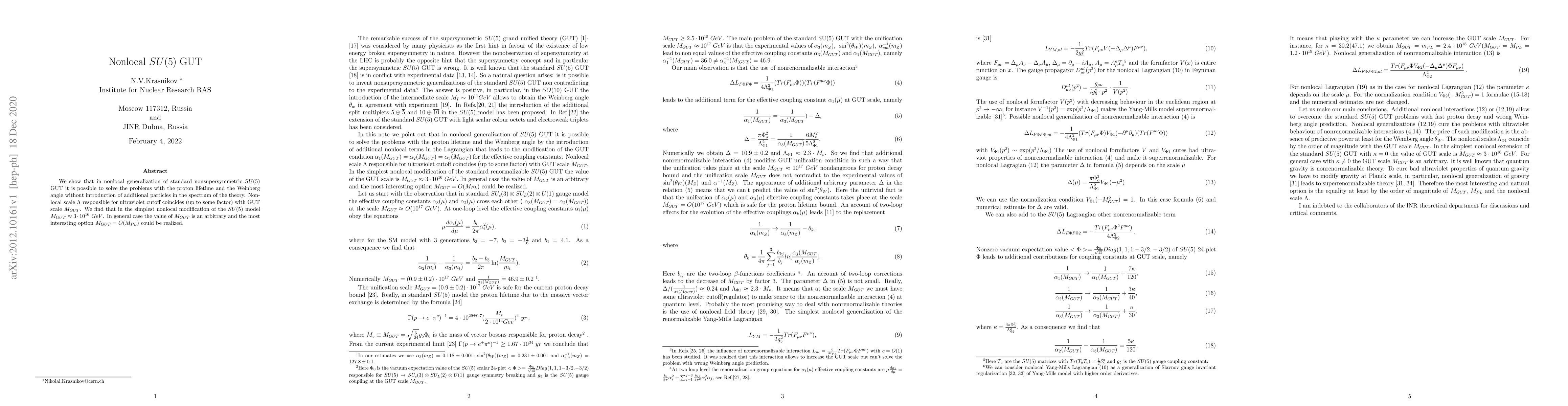 This paper proposes a nonlocal version of the SU(5) Grand Unified Theory (GUT) that resolves issues with proton lifetime and the Weinberg angle without adding new particles. The nonlocal scale serves as an ultraviolet cutoff, aligning with the GUT scale, and suggests a GUT scale of $M_{\rm GUT} = 3 * 10^{16}$ GeV in the simplest model, with the possibility of $M_{\rm GUT} = O(M_{\rm PL})$ in more general cases.