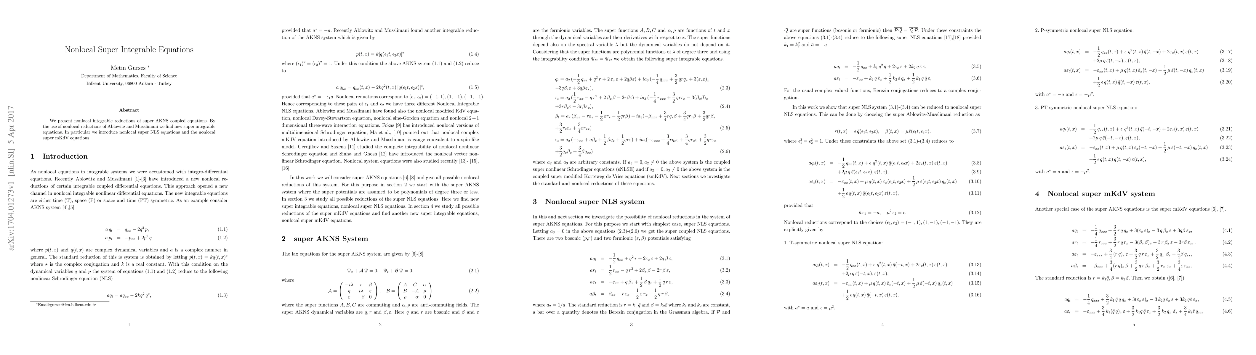 We present nonlocal integrable reductions of super AKNS coupled equations. By the use of nonlocal reductions of Ablowitz and Musslimani we find new super integrable equations. In particular we introduce nonlocal super NLS equations and the nonlocal super mKdV equations.
