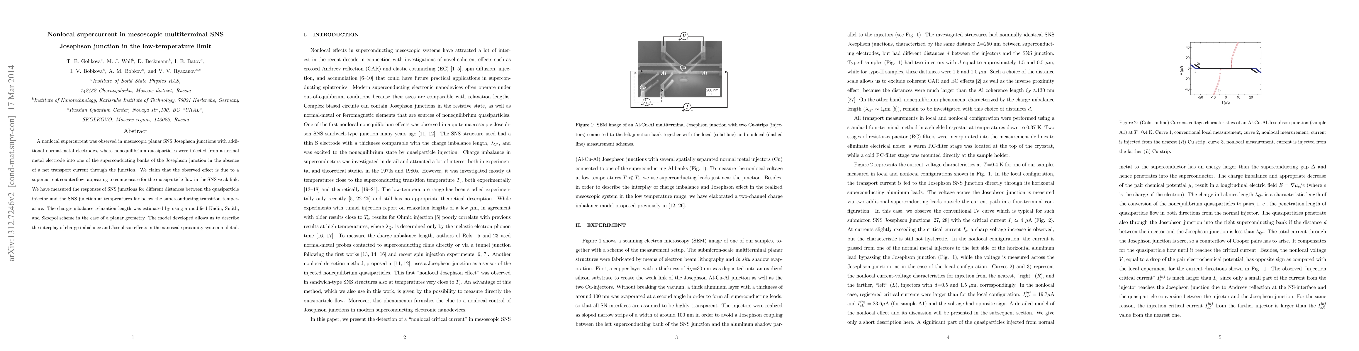 This study observed nonlocal supercurrent in a mesoscopic SNS Josephson junction with extra normal metal electrodes, attributing the effect to a supercurrent counterflow compensating quasiparticle flow. The research details the junction's response under varying distances and temperatures, estimating charge-imbalance relaxation length to model the interplay of charge imbalance and Josephson effects.