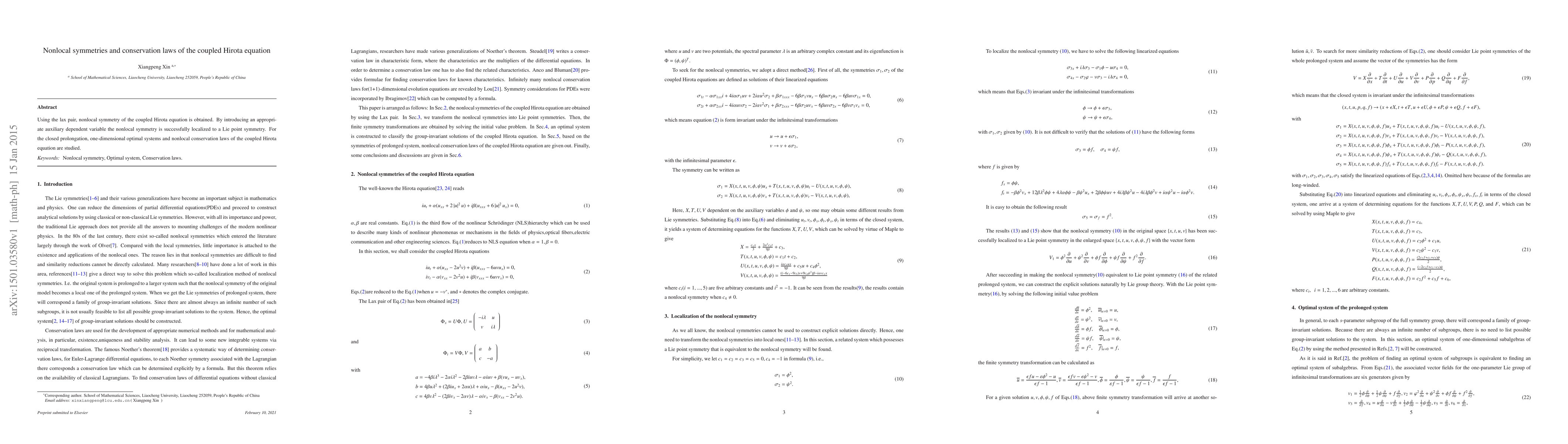 This paper explores the nonlocal symmetries of the coupled Hirota equation using a lax pair and localizes these symmetries through an auxiliary variable. It further investigates the resulting Lie point symmetries, one-dimensional optimal systems, and nonlocal conservation laws.