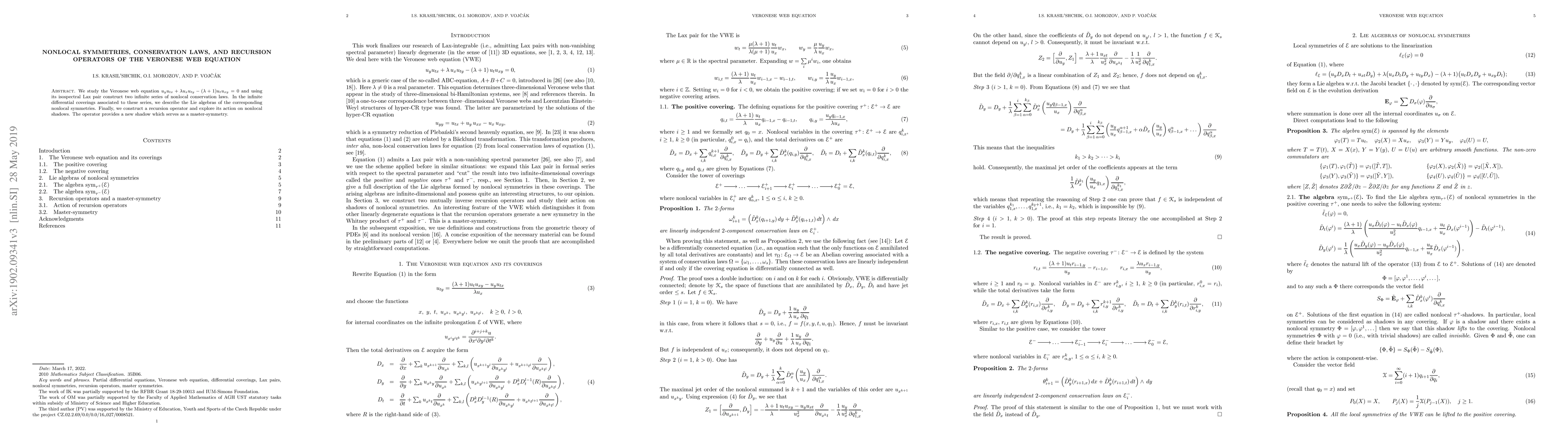 We study the Veronese web equation $u_y u_{tx}+ \lambda u_xu_{ty} - (\lambda+1)u_tu_{xy} =0$ and using its isospectral Lax pair construct two infinite series of nonlocal conservation laws. In the infinite differential coverings associated to these series, we describe the Lie algebras of the corresponding nonlocal symmetries. Finally, we construct a recursion operator and explore its action on nonlocal shadows. The operator provides a new shadow which serves as a master-symmetry.