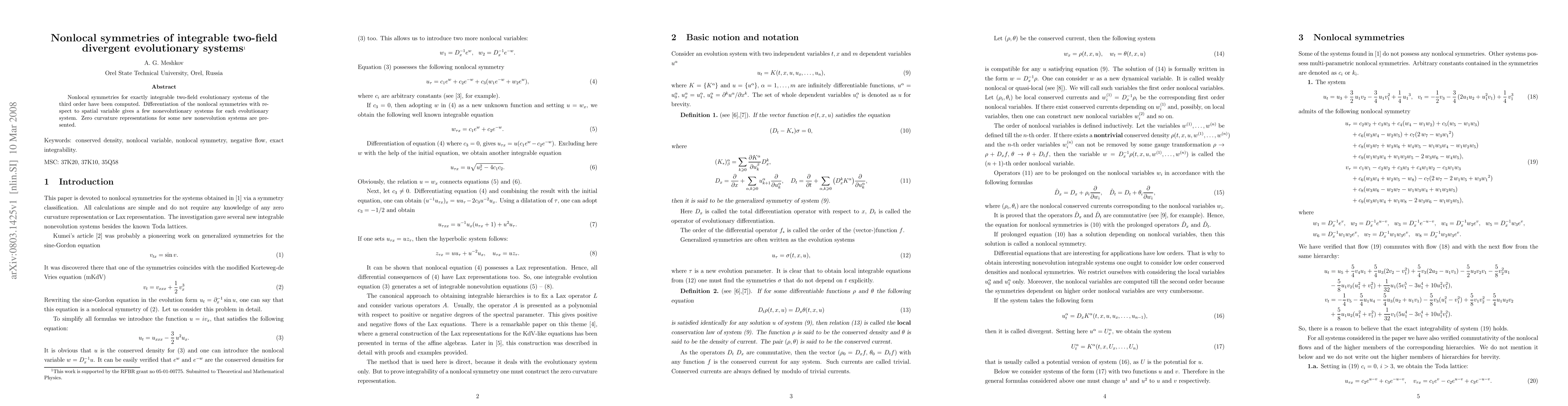 This paper computes nonlocal symmetries for exactly integrable two-field evolutionary systems of the third order, and differentiates these symmetries to derive several nonevolutionary systems, presenting zero curvature representations for some of these new nonevolutionary systems.
