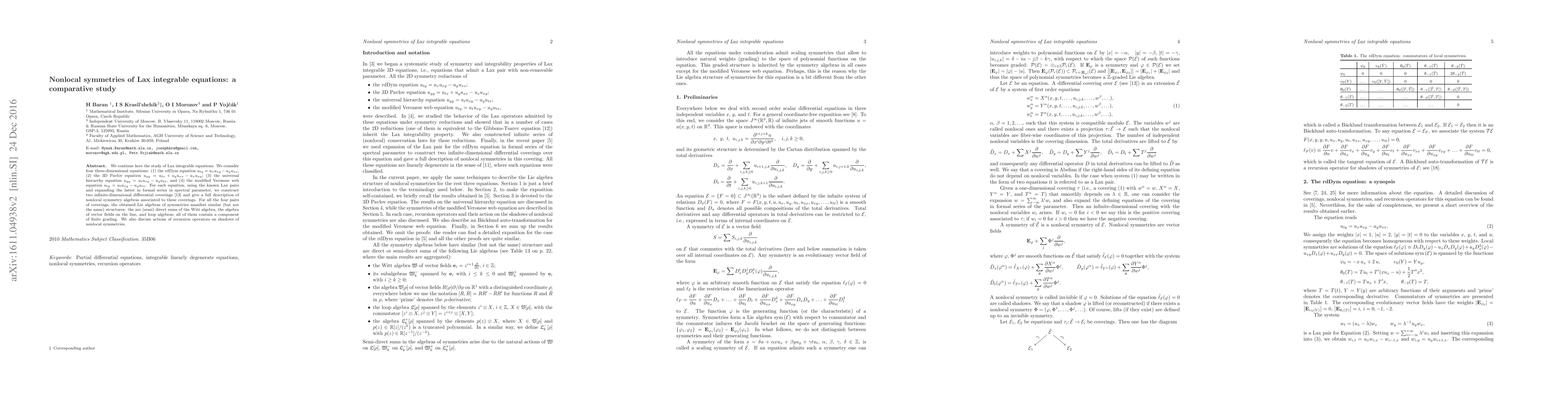 We continue here the study of Lax integrable equations. We consider four three-dimensional equations: (1) the rdDym equation $u_{ty} = u_x u_{xy} - u_y u_{xx}$, (2) the 3D Pavlov equation $u_{yy} = u_{tx} + u_y u_{xx} - u_x u_{xy}$; (3) the universal hierarchy equation $u_{yy} = u_t u_{xy} - u_y u_{tx}$, and (4) the modified Veronese web equation $u_{ty} = u_t u_{xy} - u_y u_{tx}$. For each equation, using the know Lax pairs and expanding the latter in formal series in spectral parameter, we construct two infinite-dimensional differential coverings and give a full description of nonlocal symmetry algebras associated to these coverings. For all the for pairs of coverings, the obtained Lie algebras of symmetries manifest similar (but not the same) structures: the are (semi) direct sums of the Witt algebra, the algebra of vector fields on the line, and loop algebras; all of them contain a component of finite grading. We also discuss actions of recursion operators on shadows (in the sense of [I.S.Krasil'shchik, A.M. Vinogradov, Acta Appl. Math., 15 (1989) 1-2, 161--209.]) of nonlocal symmetries.