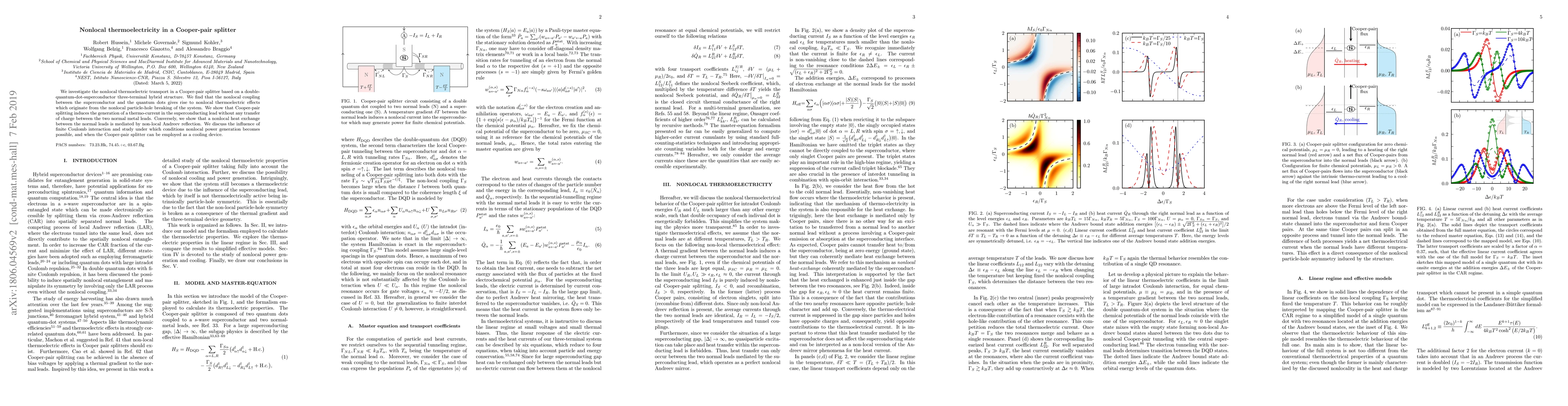 We investigate the nonlocal thermoelectric transport in a Cooper-pair splitter based on a double-quantum-dot-superconductor three-terminal hybrid structure. We find that the nonlocal coupling between the superconductor and the quantum dots gives rise to nonlocal thermoelectric effects which originate from the nonlocal particle-hole breaking of the system. We show that Cooper-pair splitting induces the generation of a thermo-current in the superconducting lead without any transfer of charge between the two normal metal leads. Conversely, we show that a nonlocal heat exchange between the normal leads is mediated by non-local Andreev reflection. We discuss the influence of finite Coulomb interaction and study under which conditions nonlocal power generation becomes possible, and when the Cooper-pair splitter can be employed as a cooling device.