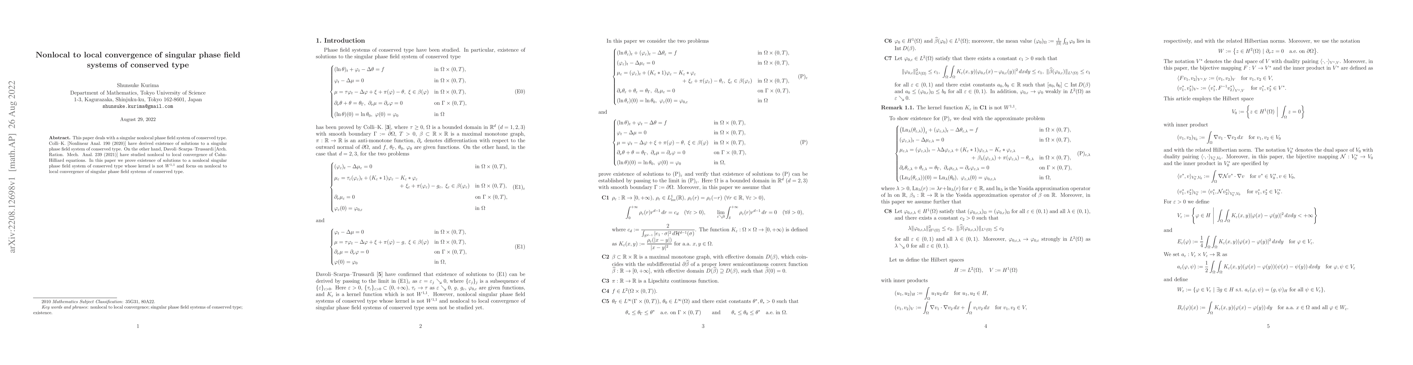 This paper establishes the existence of solutions for a singular nonlocal phase field system of conserved type and investigates the convergence from nonlocal to local forms of such systems, extending previous work on similar phase field models.