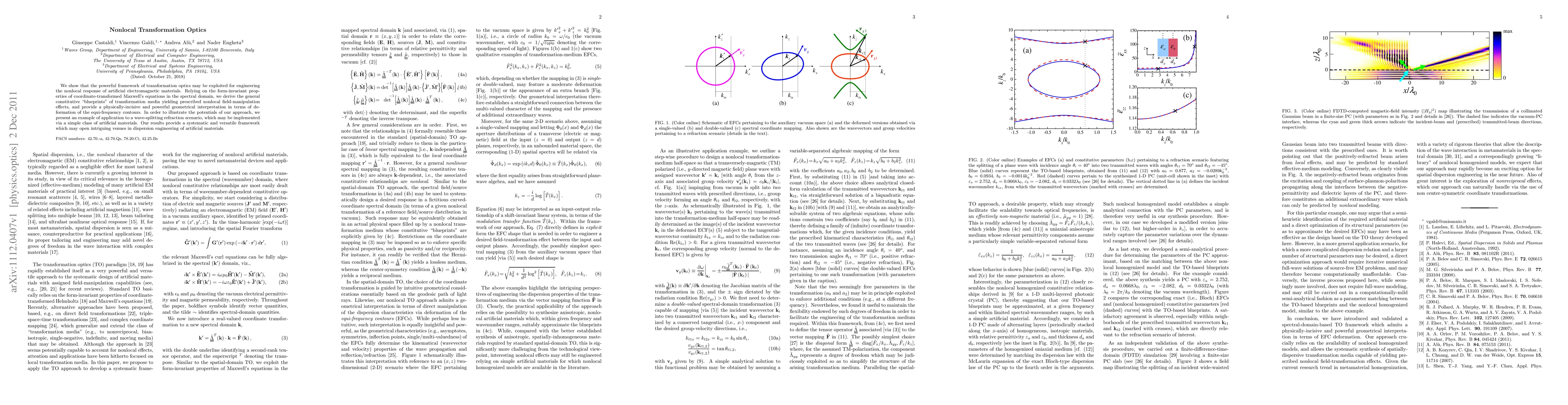 This paper develops a framework for transformation optics to engineer nonlocal electromagnetic materials, deriving the constitutive "blueprints" for desired field-manipulation effects. It illustrates the approach through a wave-splitting refraction example, showcasing its potential in dispersion engineering of artificial materials.