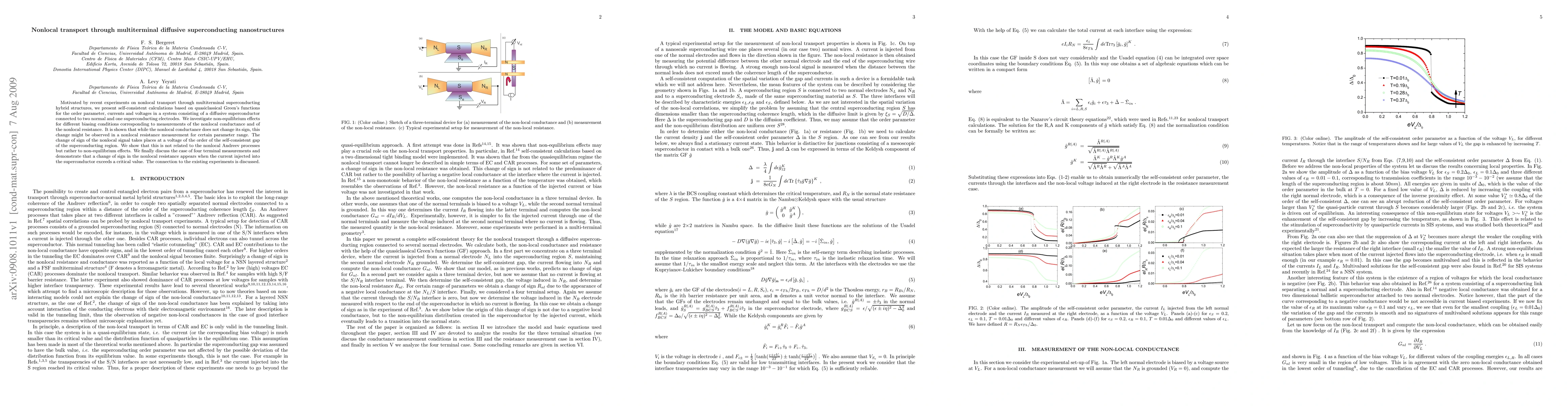 Motivated by recent experiments on nonlocal transport through multiterminal superconducting hybrid structures, we present self-consistent calculations based on quasiclassical Green's functions for the order parameter, currents and voltages in a system consisting of a diffusive superconductor connected to two normal and one superconducting electrodes. We investigate non-equilibrium effects for different biasing conditions corresponding to measurements of the nonlocal conductance and of the nonlocal resistance. It is shown that while the nonlocal conductance does not change its sign, this change might be observed in a nonlocal resistance measurement for certain parameter range. The change of sign of the nonlocal signal takes places at a voltage of the order of the self-consistent gap of the superconducting region. We show that this is not related to the nonlocal Andreev processes but rather to non-equilibrium effects. We finally discuss the case of four terminal measurements and demonstrate that a change of sign in the nonlocal resistance appears when the current injected into the superconductor exceeds a critical value. The connection to the existing experiments is discussed.