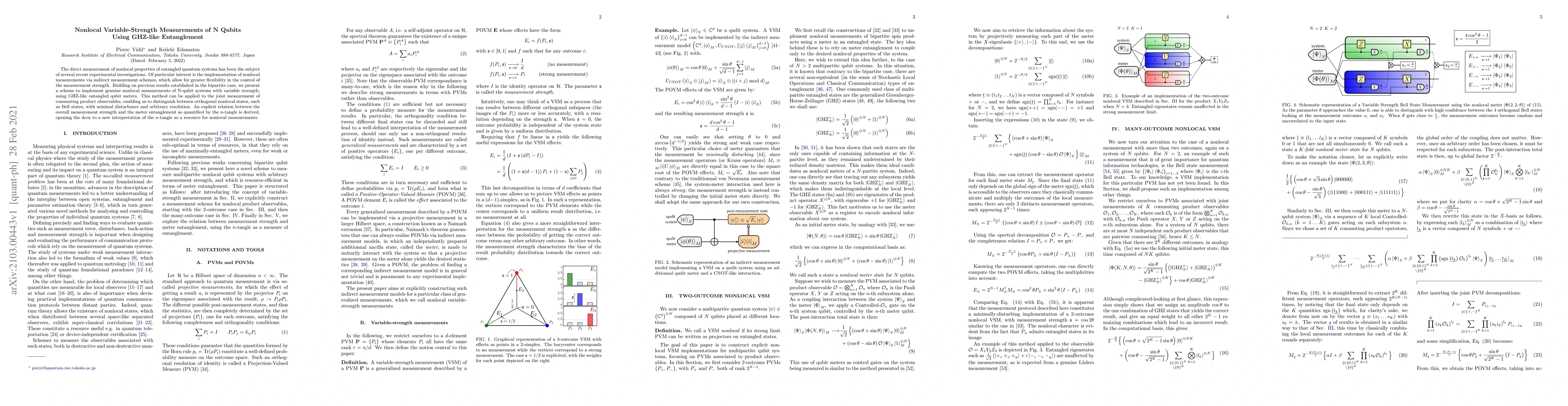 This paper proposes a method for nonlocal variable-strength measurements of N-qubit systems using GHZ-like entangled qubit meters, allowing flexible control over measurement strength. The scheme enables minimal disturbance joint measurement of commuting product observables, with an explicit relation linking measurement strength to the $n$-tangle of the meter entanglement.