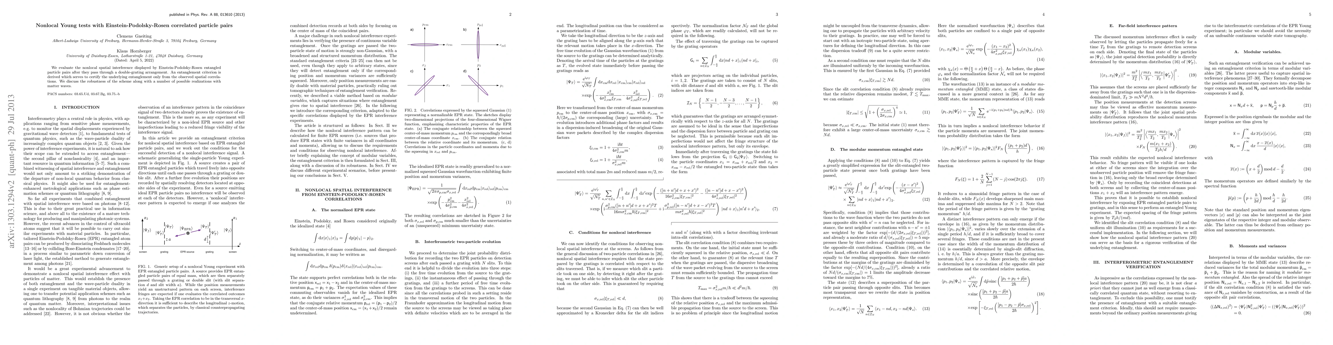 This paper evaluates nonlocal spatial interference in Einstein-Podolsky-Rosen entangled particle pairs using a double grating setup, deriving an entanglement criterion based on observed spatial correlations. The study also explores the robustness of the scheme and potential practical implementations with matter waves.