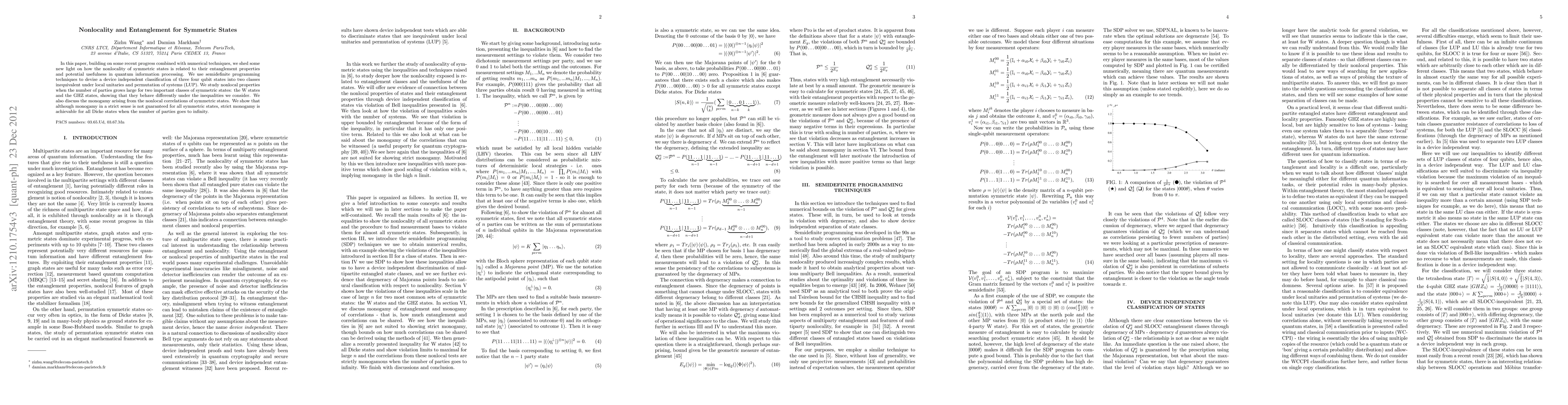 This paper explores the relationship between nonlocality and entanglement in symmetric quantum states, employing semidefinite programming to classify four-qubit states. It reveals distinct behaviors of W and GHZ states in nonlocal properties and discusses the monogamy of nonlocal correlations, showing that while strict monogamy isn't universally applicable, it holds for Dicke states in the limit of large parties.