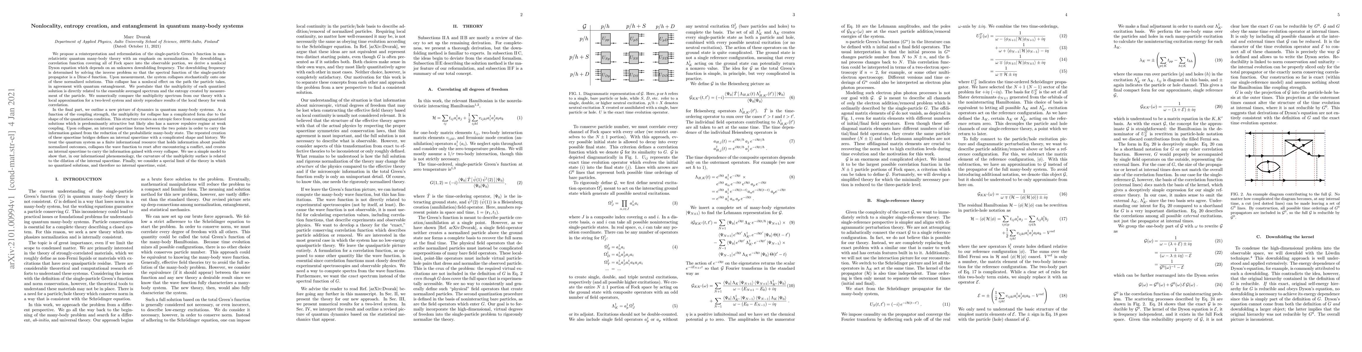 This paper reformulates the single-particle Green's function in quantum many-body theory, deriving a nonlocal Dyson equation that links measurement collapse to quantum entanglement and entropy creation. It proposes a new dynamics framework where quantized solutions generate an entropic force, creating an internal spacetime that carries information from wave function collapses.