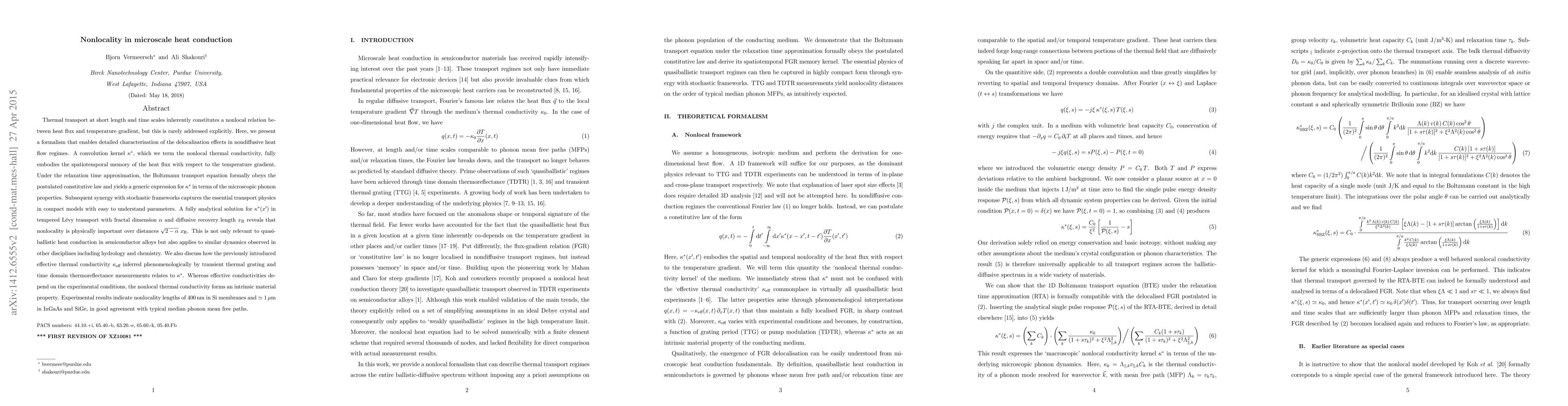 Thermal transport at short length and time scales inherently constitutes a nonlocal relation between heat flux and temperature gradient, but this is rarely addressed explicitly. Here, we present a formalism that enables detailed characterisation of the delocalisation effects in nondiffusive heat flow regimes. A convolution kernel $\kappa^{\ast}$, which we term the nonlocal thermal conductivity, fully embodies the spatiotemporal memory of the heat flux with respect to the temperature gradient. Under the relaxation time approximation, the Boltzmann transport equation formally obeys the postulated constitutive law and yields a generic expression for $\kappa^{\ast}$ in terms of the microscopic phonon properties. Subsequent synergy with stochastic frameworks captures the essential transport physics in compact models with easy to understand parameters. A fully analytical solution for $\kappa^{\ast}(x')$ in tempered L\'evy transport with fractal dimension $\alpha$ and diffusive recovery length $x_{\text{R}}$ reveals that nonlocality is physically important over distances $\sqrt{2-\alpha} \,\,x_{\text{R}}$. This is not only relevant to quasiballistic heat conduction in semiconductor alloys but also applies to similar dynamics observed in other disciplines including hydrology and chemistry. We also discuss how the previously introduced effective thermal conductivity $\kappa_{\text{eff}}$ inferred phenomenologically by transient thermal grating and time domain thermoreflectance measurements relates to $\kappa^{\ast}$. Whereas effective conductivities depend on the experimental conditions, the nonlocal thermal conductivity forms an intrinsic material property. Experimental results indicate nonlocality lengths of 400$\,$nm in Si membranes and $\simeq 1\,\mu$m in InGaAs and SiGe, in good agreement with typical median phonon mean free paths.