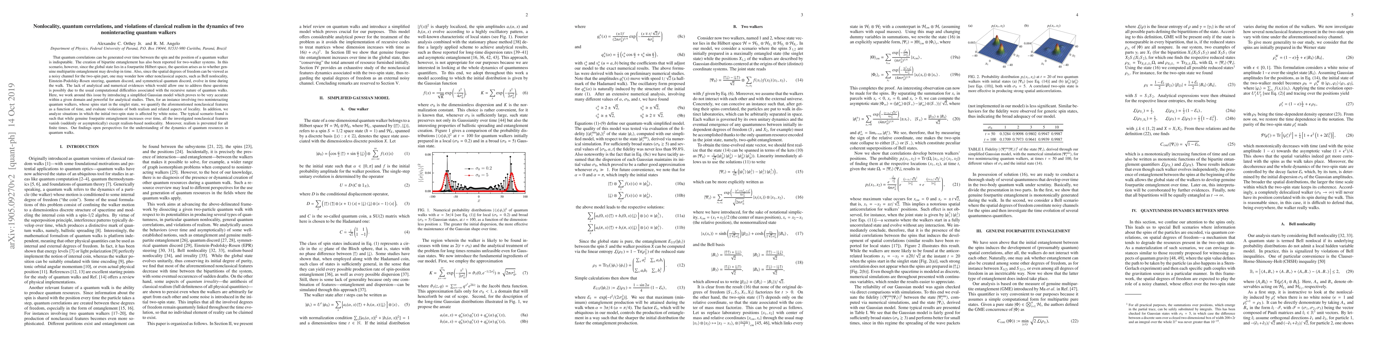 Quantum walkers exhibit nonlocality, quantum correlations, and violations of classical realism, but these features vanish except for realism-based nonlocality over time.