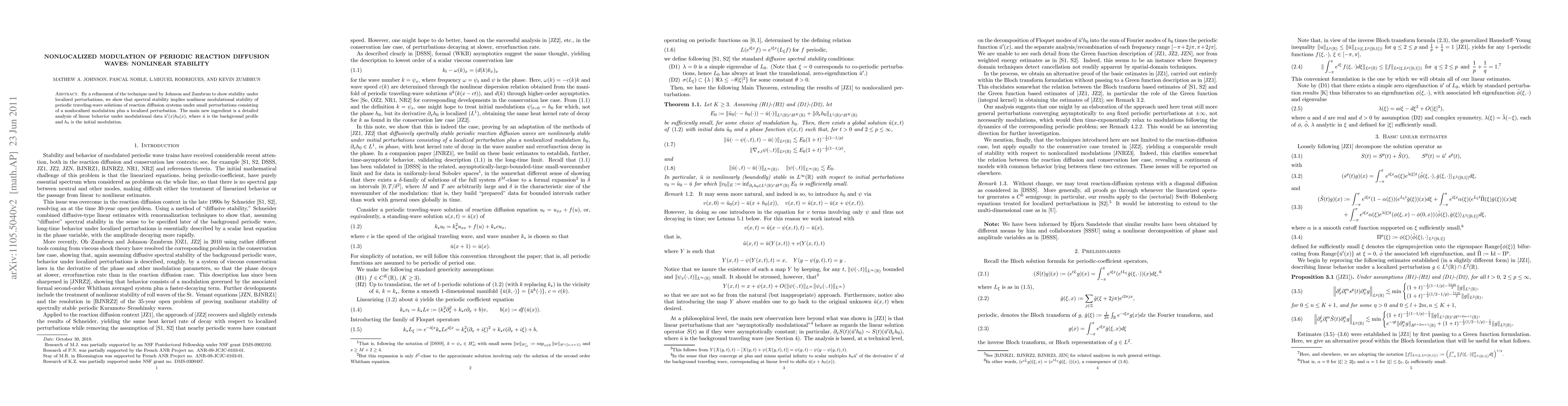 This paper demonstrates that spectral stability leads to nonlinear modulational stability for periodic traveling-wave solutions in reaction diffusion systems under small perturbations, combining both nonlocalized and localized modulations. The key innovation is a thorough analysis of linear behavior under modulational data.