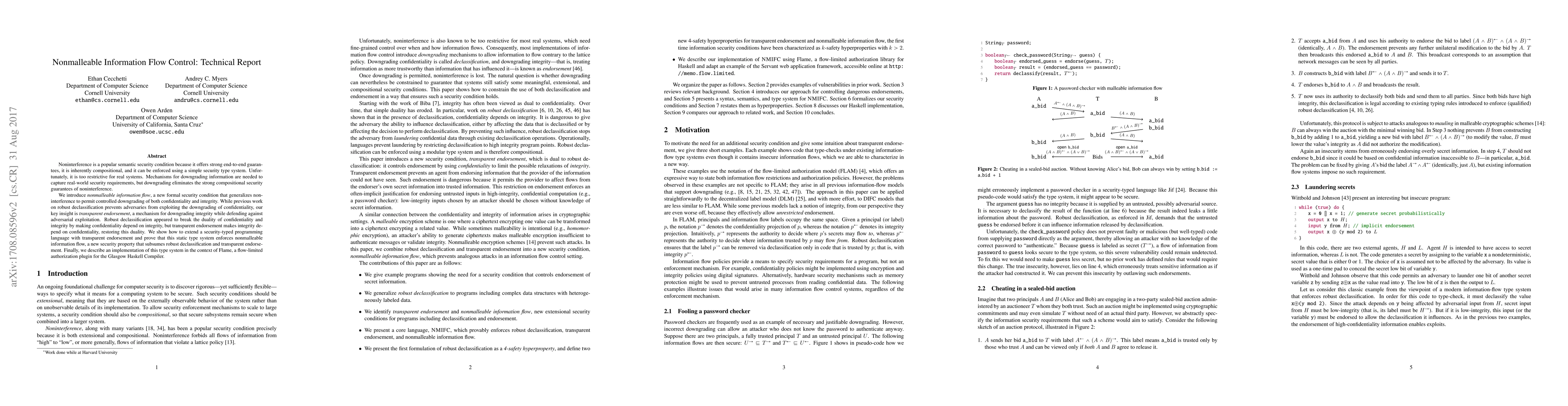 This paper introduces nonmalleable information flow, a new security condition that generalizes noninterference to allow controlled downgrading while maintaining strong security guarantees. It presents transparent endorsement to manage integrity downgrading, restoring the duality between confidentiality and integrity, and demonstrates its implementation in Flame, a Haskell compiler plugin.