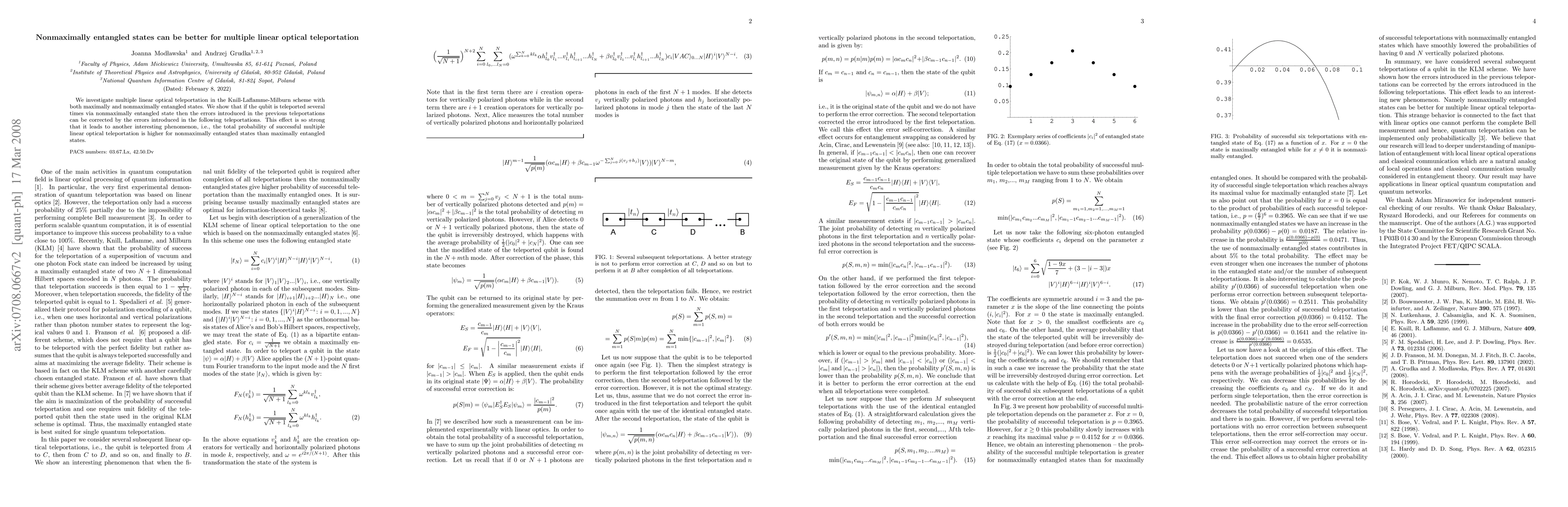 This paper explores multiple linear optical teleportation using the Knill-Laflamme-Milburn scheme, demonstrating that nonmaximally entangled states can outperform maximally entangled states by correcting errors introduced in previous teleportations, resulting in higher overall success rates.