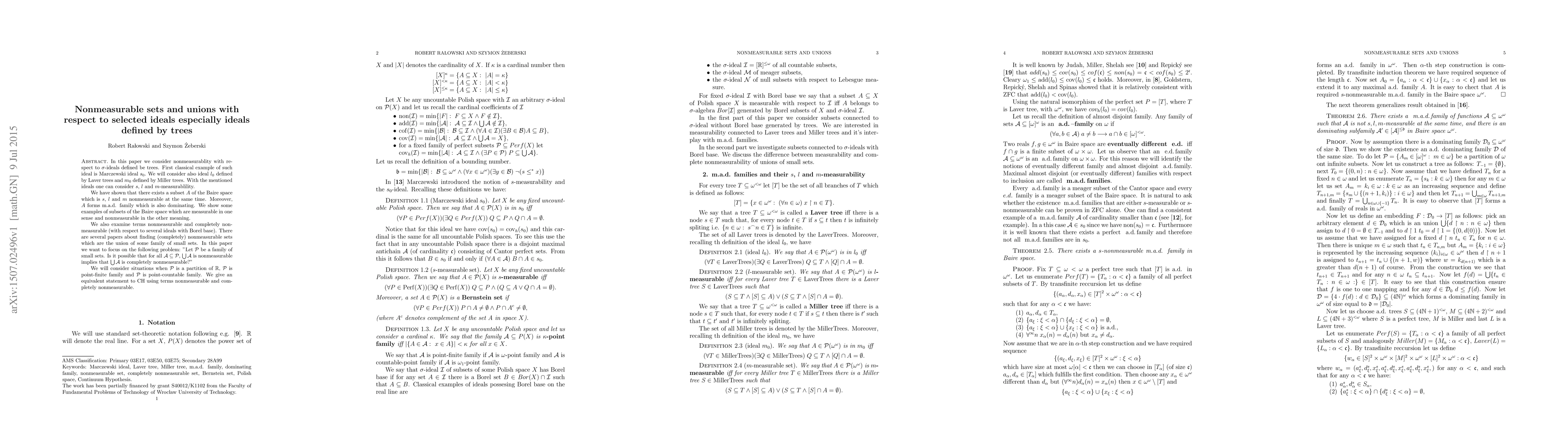 In this paper we consider nonmeasurablity with respect to sigma-ideals defined be trees. First classical example of such ideal is Marczewski ideal s_0. We will consider also ideal l_0 defined by Laver trees and m_0 defined by Miller trees. With the mentioned ideals one can consider s, l and m-measurablility. We have shown that there exists a subset A of the Baire space which is s, l and m nonmeasurable at the same time. Moreover, A forms m.a.d. family which is also dominating. We show some examples of subsets of the Baire space which are measurable in one sense and nonmeasurable in the other meaning. We also examine terms nonmeasurable and completely nonmeasurable (with respect to several ideals with Borel base). There are several papers about finding (completely) nonmeasurable sets which are the union of some family of small sets. In this paper we want to focus on the following problem: "Let P be a family of small sets. Is it possible that for all A which is a subset of P, union of A is nonmeasurable implies that union of A is completely nonmeasurable?" We will consider situations when P is a partition of R, P is point-finite family and P is point-countable family. We give an equivalent statement to CH using terms nonmeasurable and completely nonmeasurable.