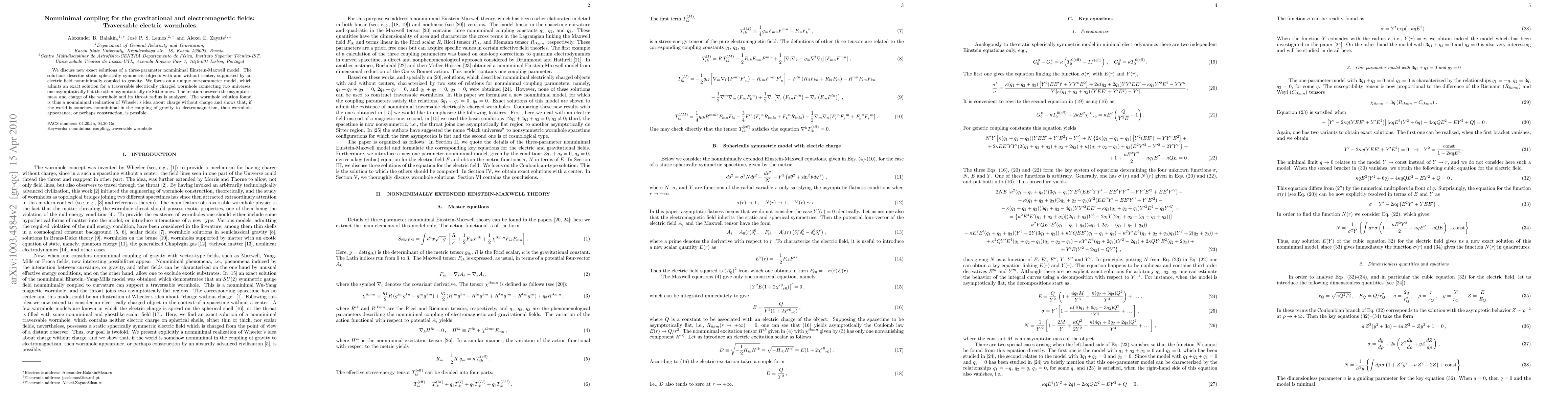 This paper presents new exact solutions in a nonminimal Einstein-Maxwell model, describing static spherically symmetric objects supported by an electric field coupled to gravity. It highlights a unique model with a traversable electrically charged wormhole connecting two universes, analyzing the relationship between its mass, charge, and throat radius.