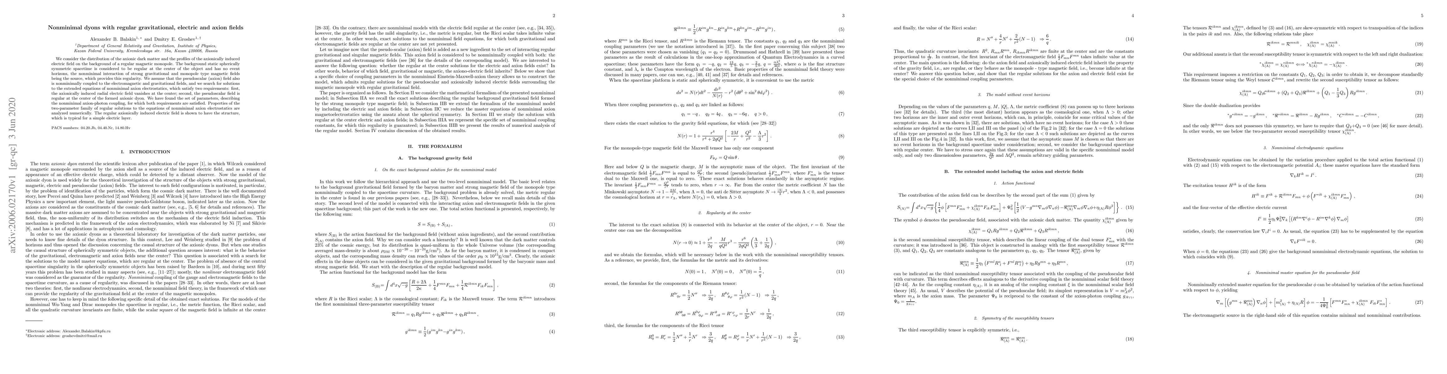 We consider the distribution of the axionic dark matter and the profiles of the axionically induced electric field on the background of a regular magnetic monopole. The background static spherically symmetric spacetime is considered to be regular at the center of the object and has no event horizons, the nonminimal interaction of strong gravitational and monopole type magnetic fields being the source, which provides this regularity. We assume that the pseudoscalar (axion) field also is nonminimally coupled to the electromagnetic and gravitational fields, and we search for solutions to the extended equations of nonminimal axion electrostatics, which satisfy two requirements: first, the axionically induced radial electric field vanishes at the center; second, the pseudoscalar field is regular at the center of the formed axionic dyon. We have found the set of parameters, describing the nonminimal axion-photon coupling, for which both requirements are satisfied. Properties of the two-parameter family of regular solutions to the equations of nonminimal axion electrostatics are analyzed numerically. The regular axionically induced electric field is shown to have the structure, which is typical for a simple electric layer.