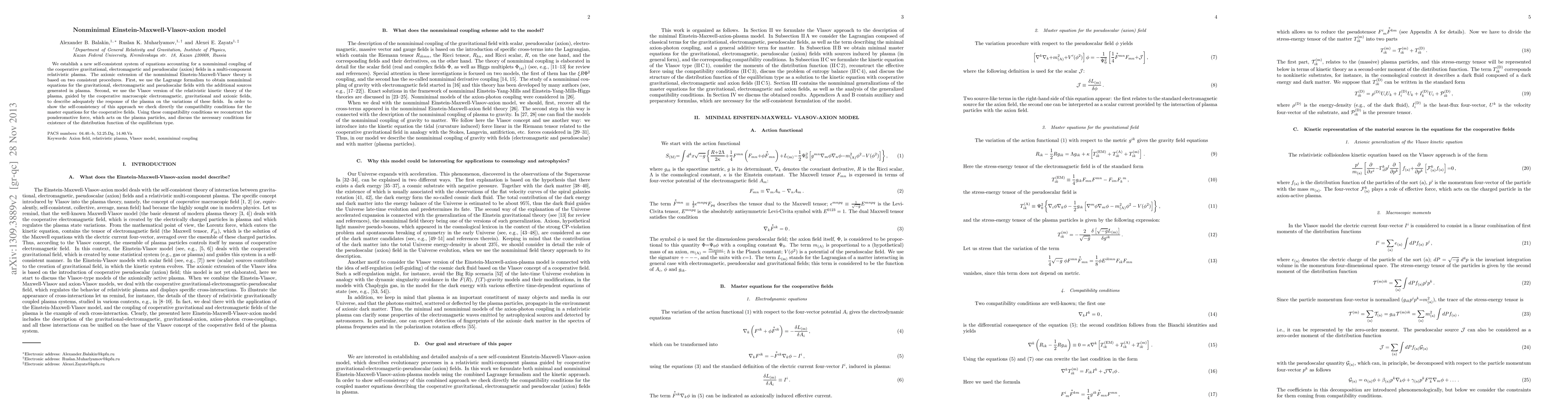 We establish a new self-consistent system of equations accounting for a nonminimal coupling of the cooperative gravitational, electromagnetic and pseudoscalar (axion) fields in a multi-component relativistic plasma. The axionic extension of the nonminimal Einstein-Maxwell-Vlasov theory is based on two consistent procedures. First, we use the Lagrange formalism to obtain nonminimal equations for the gravitational, electromagnetic and pseudoscalar fields with the additional sources generated in plasma. Second, we use the Vlasov version of the relativistic kinetic theory of the plasma, guided by the cooperative macroscopic electromagnetic, gravitational and axionic fields, to describe adequately the response of the plasma on the variations of these fields. In order to show the self-consistency of this approach we check directly the compatibility conditions for the master equations for the cooperative fields. Using these compatibility conditions we reconstruct the ponderomotive force, which acts on the plasma particles, and discuss the necessary conditions for existence of the distribution function of the equilibrium type.