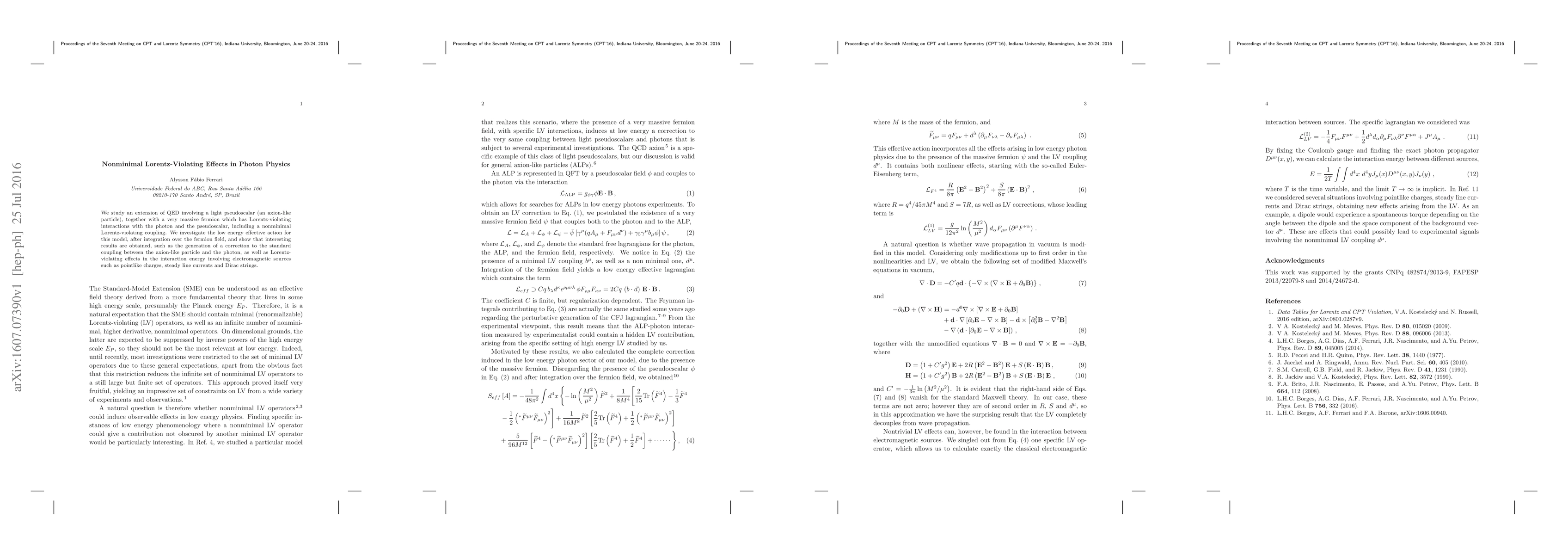 We study an extension of QED involving a light pseudoscalar (an axion-like particle), together with a very massive fermion which has Lorentz-violating interactions with the photon and the pseudoscalar, including a nonminimal Lorentz-violating coupling. We investigate the low energy effective action for this model, after integration over the fermion field, and show that interesting results are obtained, such as the generation of a correction to the standard coupling between the axion-like particle and the photon, as well as Lorentz-violating effects in the interaction energy involving electromagnetic sources such as pointlike charges, steady line currents and Dirac strings.