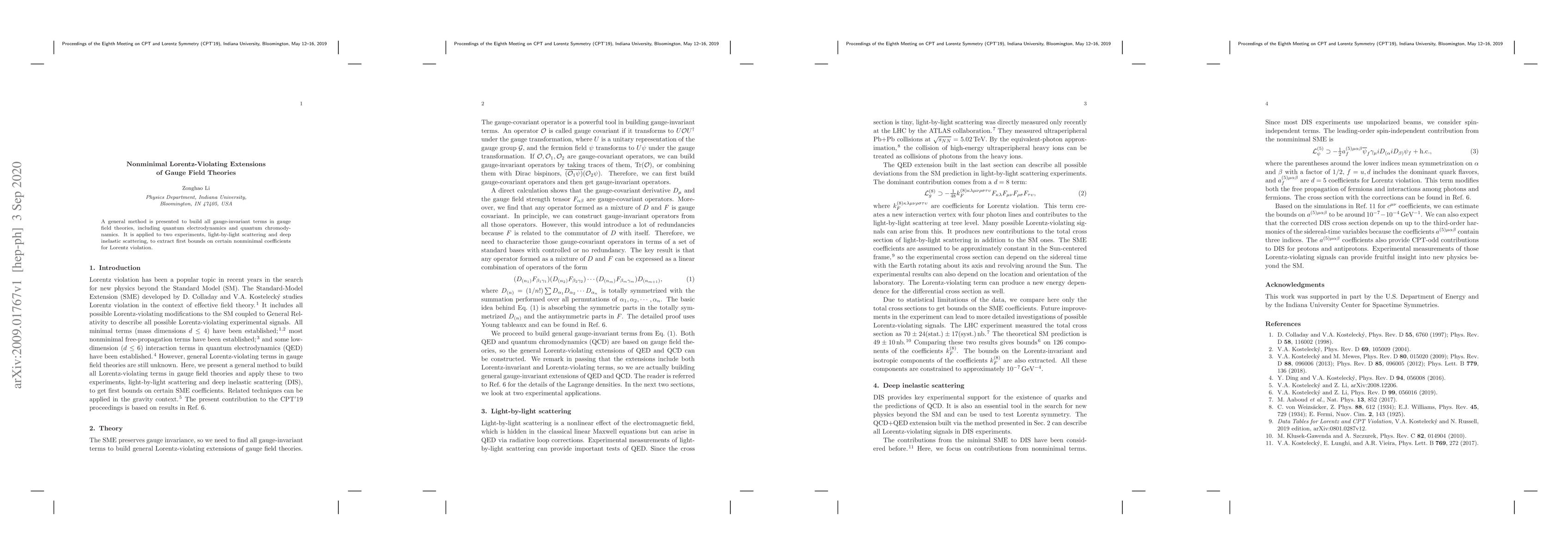 This paper develops a method to construct gauge-invariant terms in gauge field theories, applying it to extract initial bounds on nonminimal coefficients for Lorentz violation in light-by-light scattering and deep inelastic scattering experiments. The results provide new insights into potential Lorentz symmetry violations.