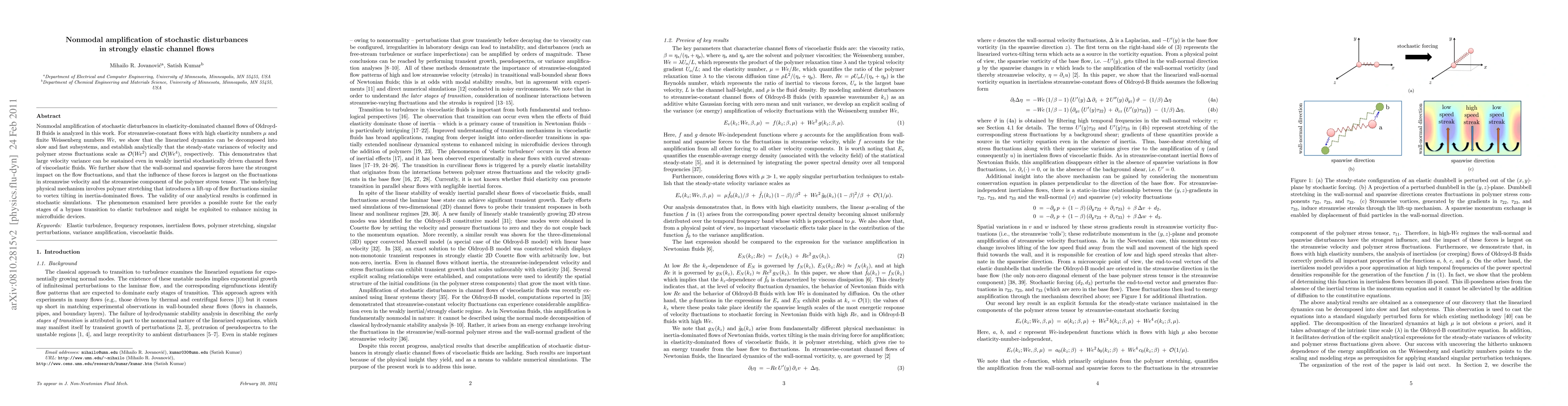 This paper analyzes nonmodal amplification of stochastic disturbances in elasticity-dominated channel flows of Oldroyd-B fluids, showing that velocity and polymer stress fluctuations scale with $O(We^2)$ and $O(We^4)$ respectively. The study reveals that polymer stretching drives significant fluctuations, potentially leading to elastic turbulence and enhanced mixing in microfluidic devices.