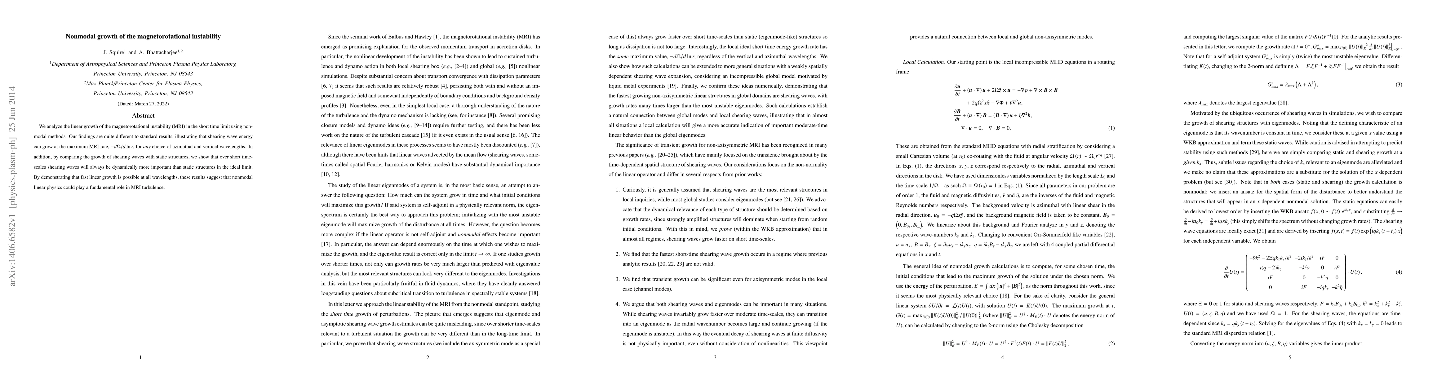 This paper investigates the linear growth of the magnetorotational instability (MRI) using nonmodal methods, revealing that shearing wave energy can grow at the maximum MRI rate for any wavelength, suggesting nonmodal linear dynamics are crucial for MRI turbulence. Over short time-scales, shearing waves are dynamically more significant than static structures.