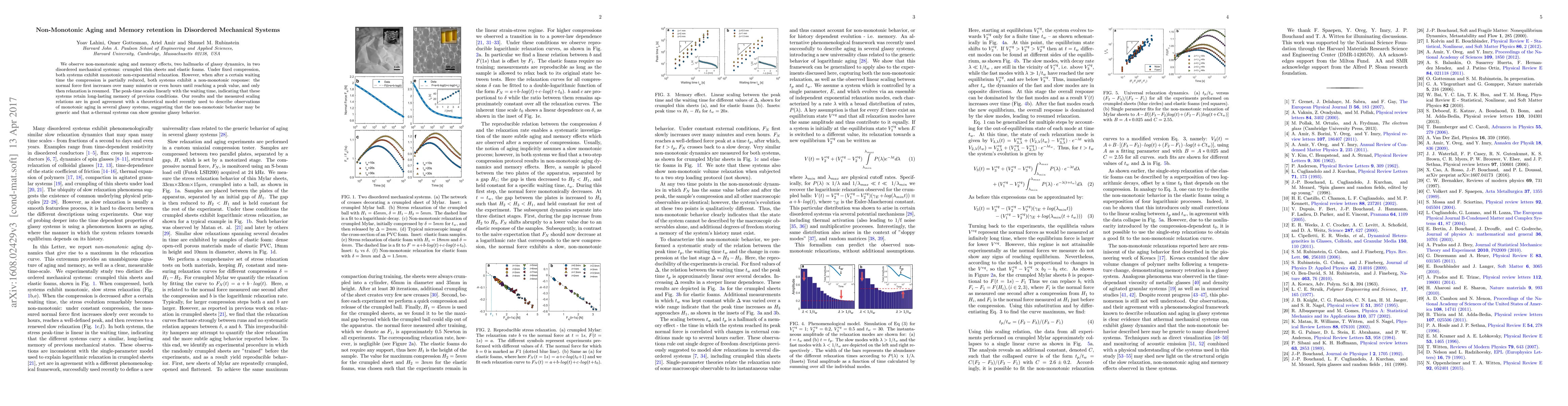 This study investigates non-monotonic aging and memory effects in disordered mechanical systems, specifically crumpled thin sheets and elastic foams, revealing that these systems exhibit peak-force responses following partial decompression after fixed compression, consistent with glassy dynamics and suggesting that these behaviors may be generic in a-thermal systems. The findings align with a theoretical model describing similar phenomena in glassy materials.