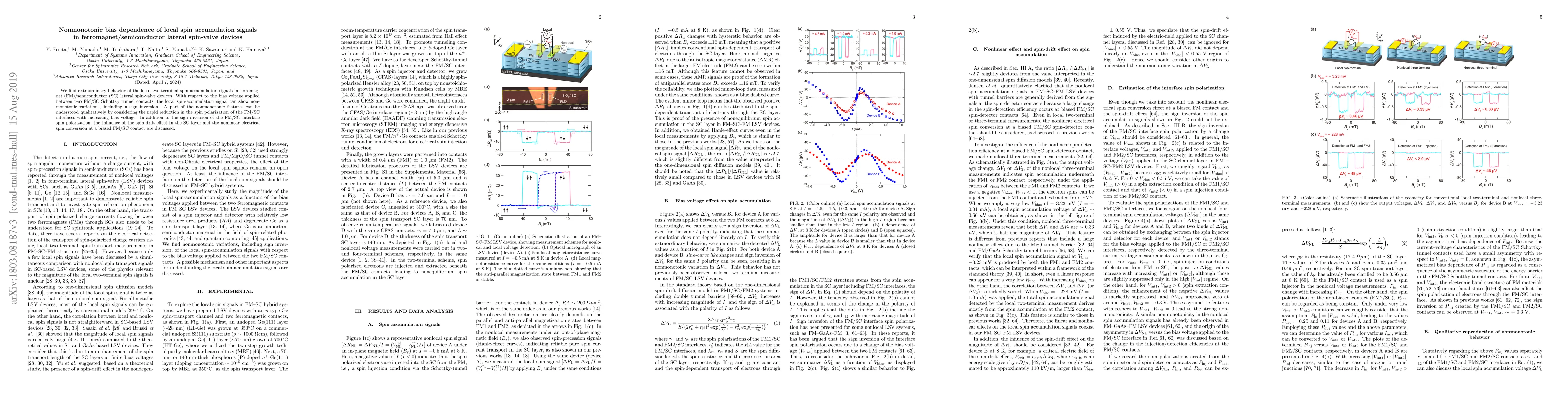 This research investigates the nonmonotonic behavior of local spin accumulation signals in ferromagnet/semiconductor lateral spin-valve devices, revealing that the signal can invert with bias voltage, partly due to the reduction in spin polarization at FM/SC interfaces. The study also considers the spin-drift effect and nonlinear spin conversion at biased contacts.