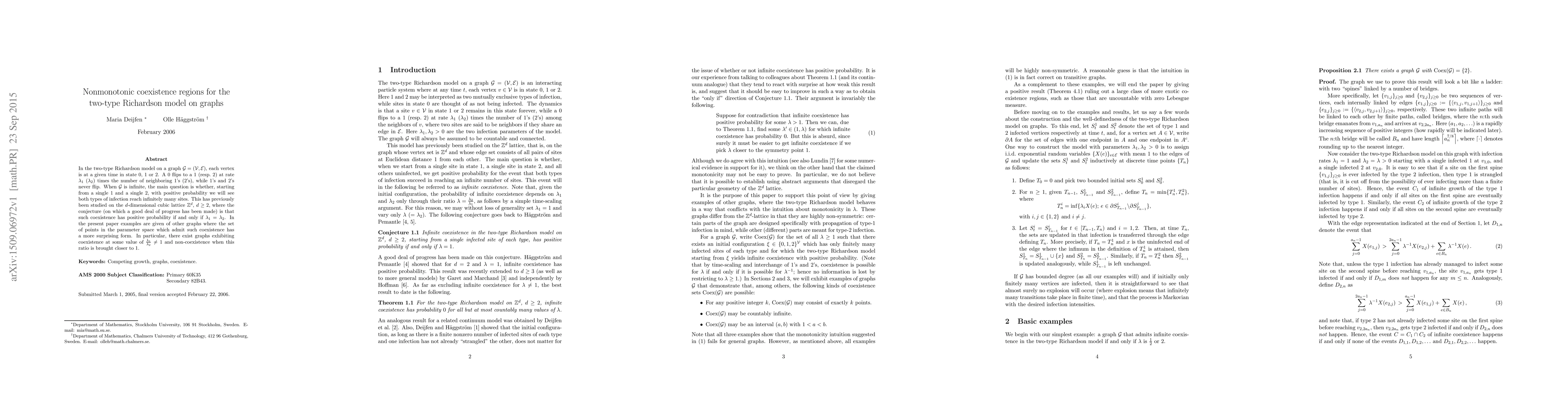 In the two-type Richardson model on a graph $\mathcal{G}=(\mathcal{V},\mathcal{E})$, each vertex is at a given time in state $0$, $1$ or $2$. A $0$ flips to a $1$ (resp.\ $2$) at rate $\lambda_1$ ($\lambda_2$) times the number of neighboring $1$'s ($2$'s), while $1$'s and $2$'s never flip. When $\mathcal{G}$ is infinite, the main question is whether, starting from a single $1$ and a single $2$, with positive probability we will see both types of infection reach infinitely many sites. This has previously been studied on the $d$-dimensional cubic lattice $\mathbb{Z}^d$, $d\geq 2$, where the conjecture (on which a good deal of progress has been made) is that such coexistence has positive probability if and only if $\lambda_1=\lambda_2$. In the present paper examples are given of other graphs where the set of points in the parameter space which admit such coexistence has a more surprising form. In particular, there exist graphs exhibiting coexistence at some value of $\frac{\lambda_1}{\lambda_2} \neq 1$ and non-coexistence when this ratio is brought closer to $1$.
