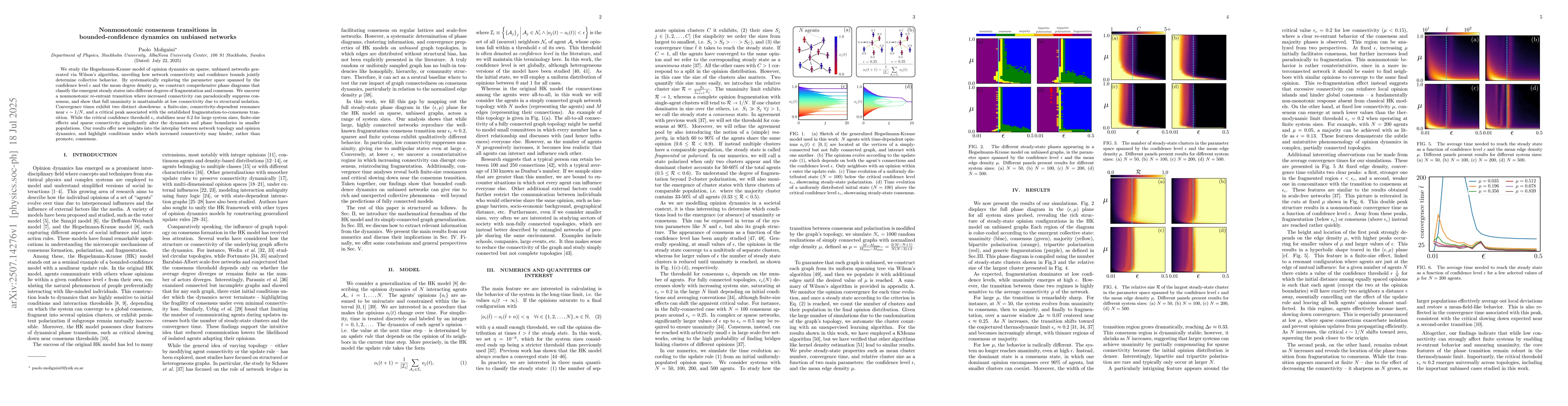 We study the Hegselmann-Krause model of opinion dynamics on sparse, unbiased networks generated via Wilson's algorithm, unveiling how network connectivity and confidence bounds jointly determine collective behavior. By systematically exploring the parameter space spanned by the confidence level $\epsilon$ and the mean degree density $\mu$, we construct comprehensive phase diagrams that classify the emergent steady states into different degrees of fragmentation and consensus. We uncover a nonmonotonic re-entrant transition where increased connectivity can paradoxically suppress consensus, and show that full unanimity is unattainable at low connectivity due to structural isolation. Convergence times exhibit two distinct slowdowns: a finite-size, connectivity-dependent resonance near $\epsilon \sim 1/N$, and a critical peak associated with the established fragmentation-to-consensus transition. While the critical confidence threshold $\epsilon_c$ stabilizes near 0.2 for large system sizes, finite-size effects and sparse connectivity significantly alter the dynamics and phase boundaries in smaller populations. Our results offer new insights into the interplay between network topology and opinion dynamics, and highlight conditions under which increased connectivity may hinder, rather than promote, consensus.