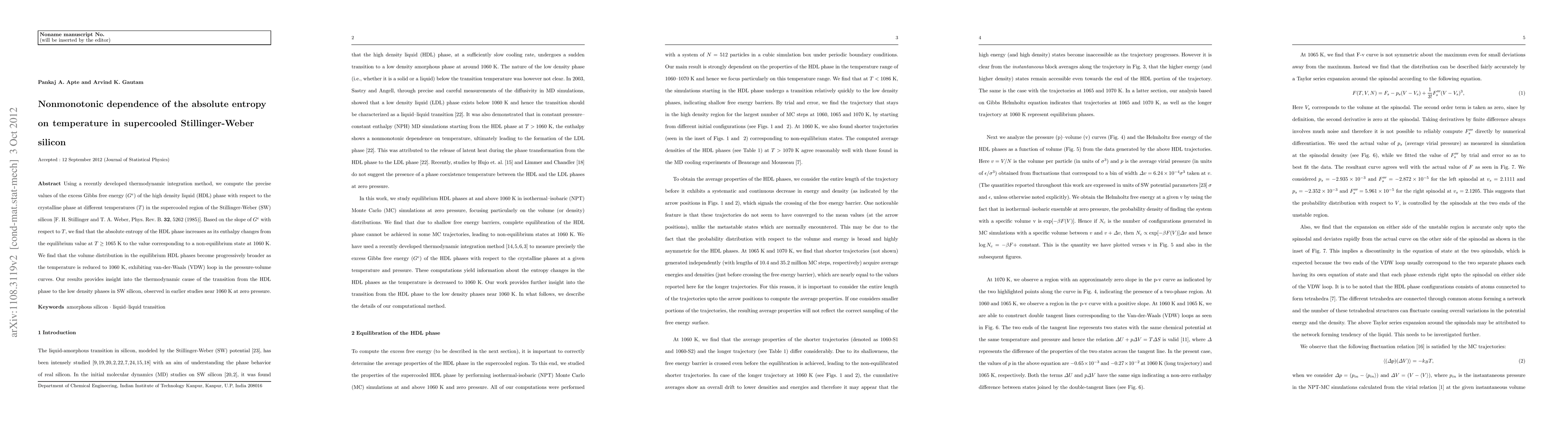 This study reveals a nonmonotonic relationship between absolute entropy and temperature in supercooled Stillinger-Weber silicon, finding that entropy increases as the high-density liquid phase transitions from equilibrium to a non-equilibrium state. The broader volume distribution and van-der-Waals loop formation at lower temperatures provide insight into the thermodynamic transition to low-density phases.