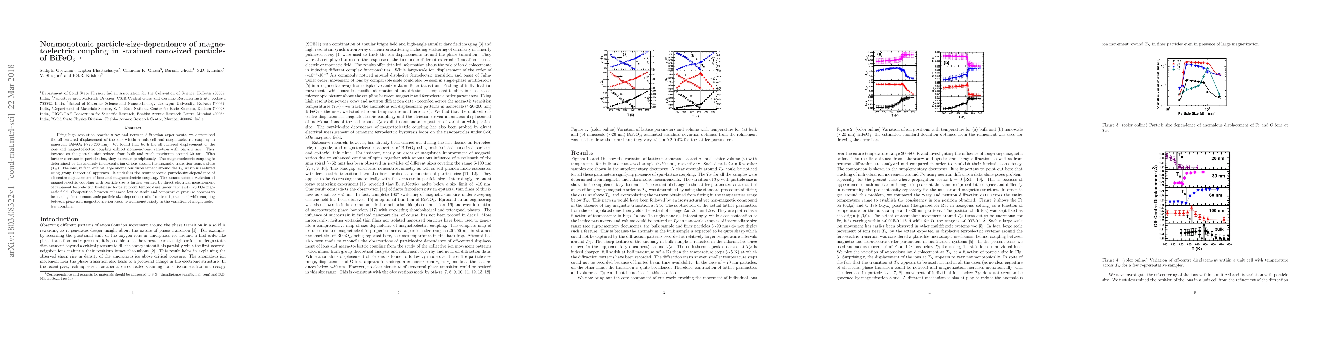 This study explores the nonmonotonic particle-size-dependence of magnetoelectric coupling in strained nanosized BiFeO$_3$ particles via high-resolution diffraction and electrical measurements. The coupling and off-center ion displacement peak around 30 nm before decreasing sharply, attributed to lattice strain and piezo-magnetostriction interactions.