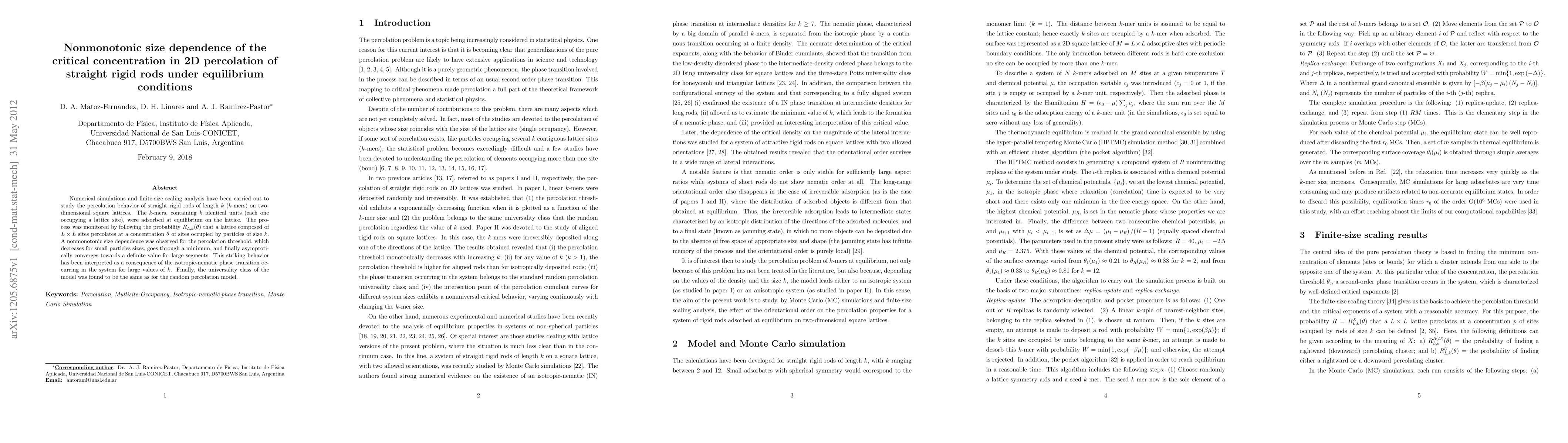 This study investigates the percolation behavior of straight rigid rods on two-dimensional square lattices using numerical simulations and finite-size scaling analysis. A nonmonotonic size dependence of the percolation threshold was observed, indicating a complex interplay between particle size and percolation probability.
