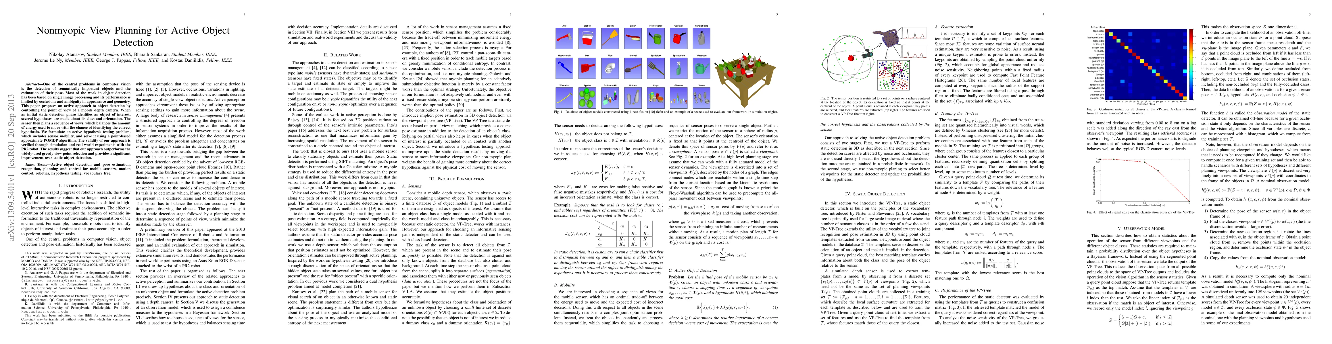 The research proposes a nonmyopic view planning approach for active object detection using a mobile depth camera. It formulates an active hypothesis testing problem, solved via a point-based approximate POMDP algorithm, to balance energy use for sensor motion with the chance of identifying the correct object hypothesis.