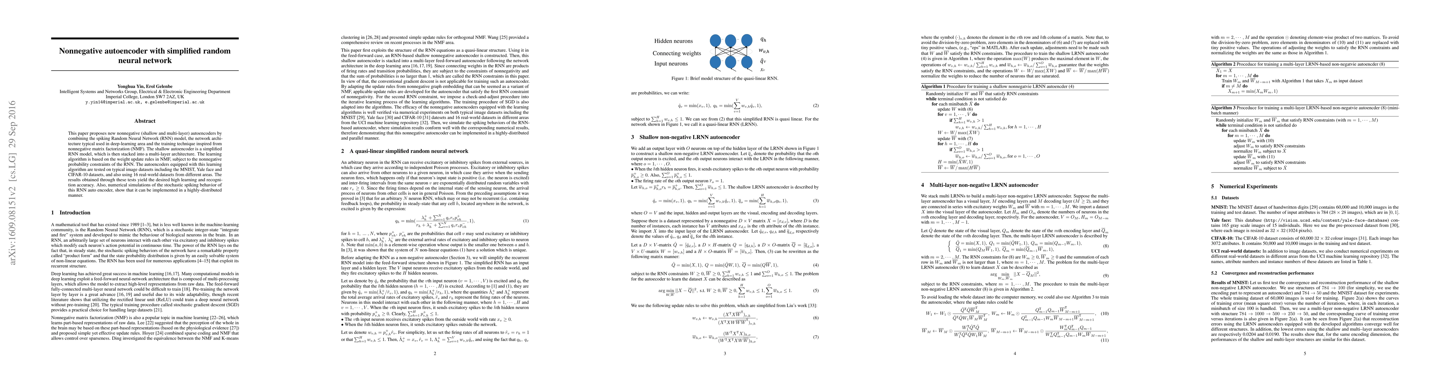 This paper proposes new nonnegative (shallow and multi-layer) autoencoders by combining the spiking Random Neural Network (RNN) model, the network architecture typical used in deep-learning area and the training technique inspired from nonnegative matrix factorization (NMF). The shallow autoencoder is a simplified RNN model, which is then stacked into a multi-layer architecture. The learning algorithm is based on the weight update rules in NMF, subject to the nonnegative probability constraints of the RNN. The autoencoders equipped with this learning algorithm are tested on typical image datasets including the MNIST, Yale face and CIFAR-10 datasets, and also using 16 real-world datasets from different areas. The results obtained through these tests yield the desired high learning and recognition accuracy. Also, numerical simulations of the stochastic spiking behavior of this RNN auto encoder, show that it can be implemented in a highly-distributed manner.