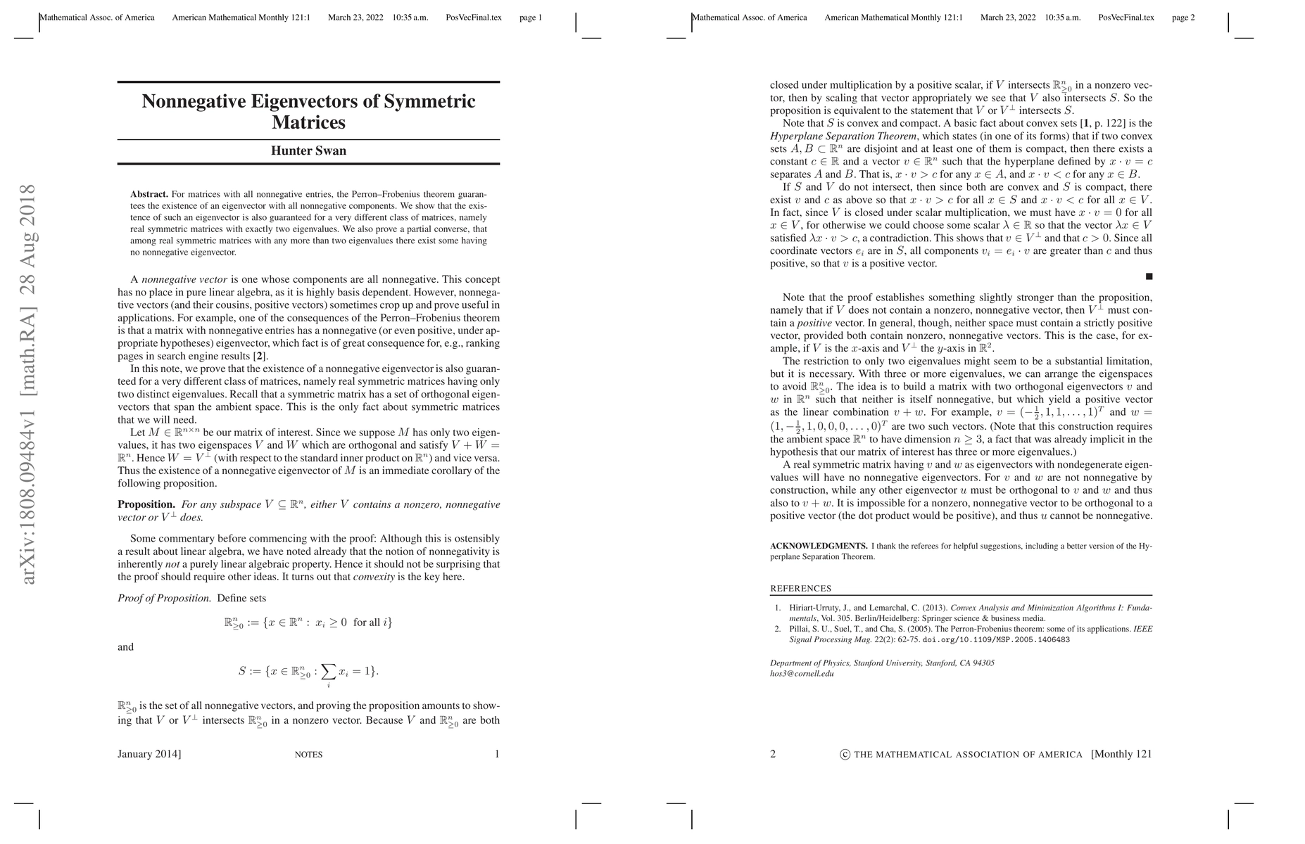 Summary: This paper demonstrates that real symmetric matrices with exactly two eigenvalues always have nonnegative eigenvectors, extending the Perron-Frobenius theorem's guarantee. It also proves a partial converse showing that matrices with more than two eigenvalues can lack nonnegative eigenvectors.