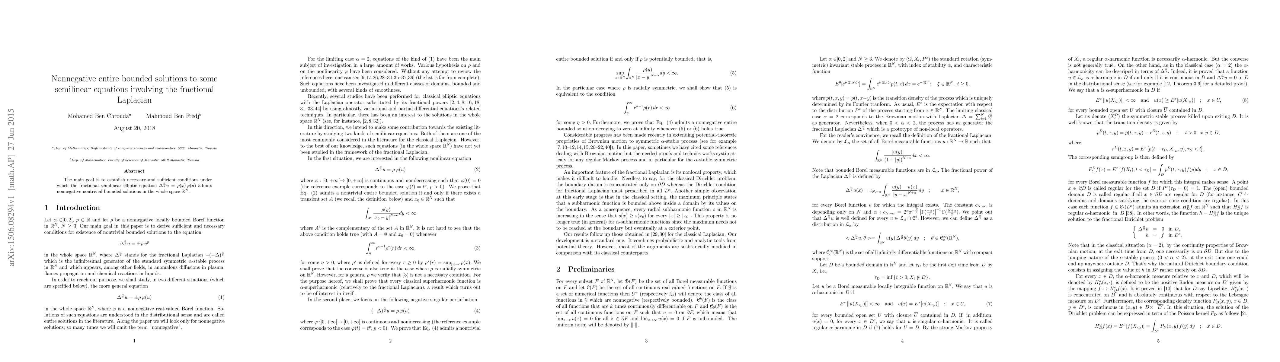 Summary: This paper establishes necessary and sufficient conditions for the existence of nonnegative, bounded solutions to the fractional semilinear elliptic equation $\Delta^{\frac{\alpha}{2}} u=\rho(x)\,\varphi(u)$ in the entire space $\mathbb{R}^N$. The findings provide a comprehensive framework for understanding such solutions.