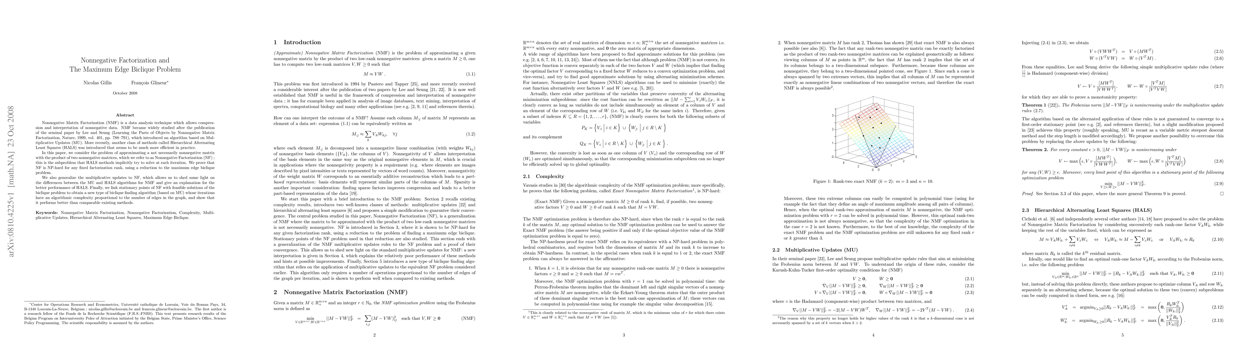 This paper investigates Nonnegative Factorization (NF), proving it to be NP-hard when fixed at a certain rank through a reduction to the maximum edge biclique problem. It also generalizes multiplicative updates to NF, offering insights into the efficiency of Hierarchical Alternating Least Squares (HALS) over Multiplicative Updates (MU) algorithms and introduces a new biclique finding algorithm based on MU, demonstrating superior performance.