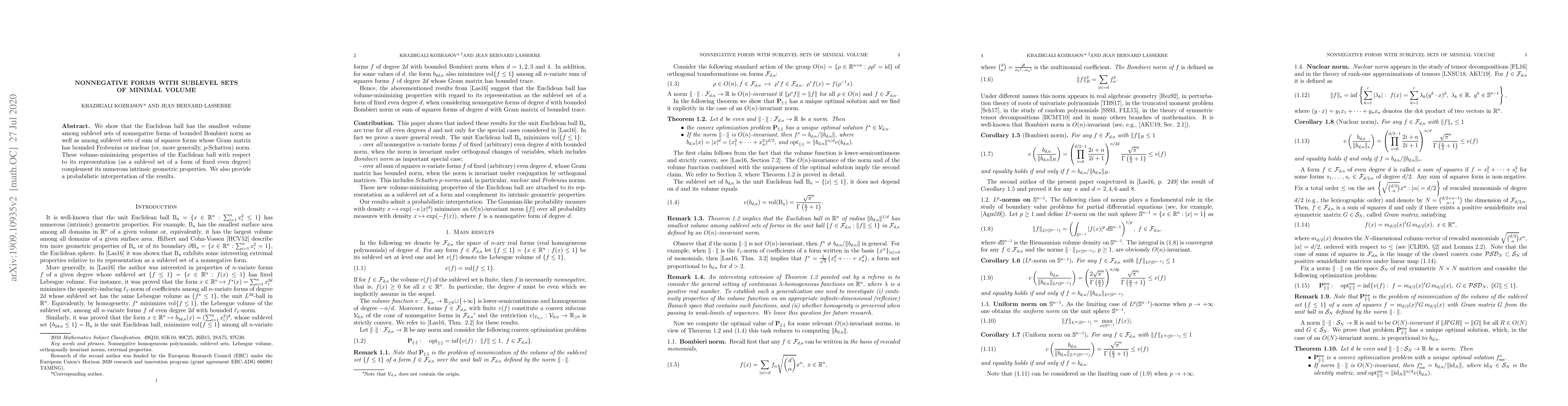 This paper demonstrates that the Euclidean ball minimizes the volume among sublevel sets of nonnegative forms with bounded norms, including forms of fixed even degree. It also offers a probabilistic interpretation of these volume-minimizing properties.