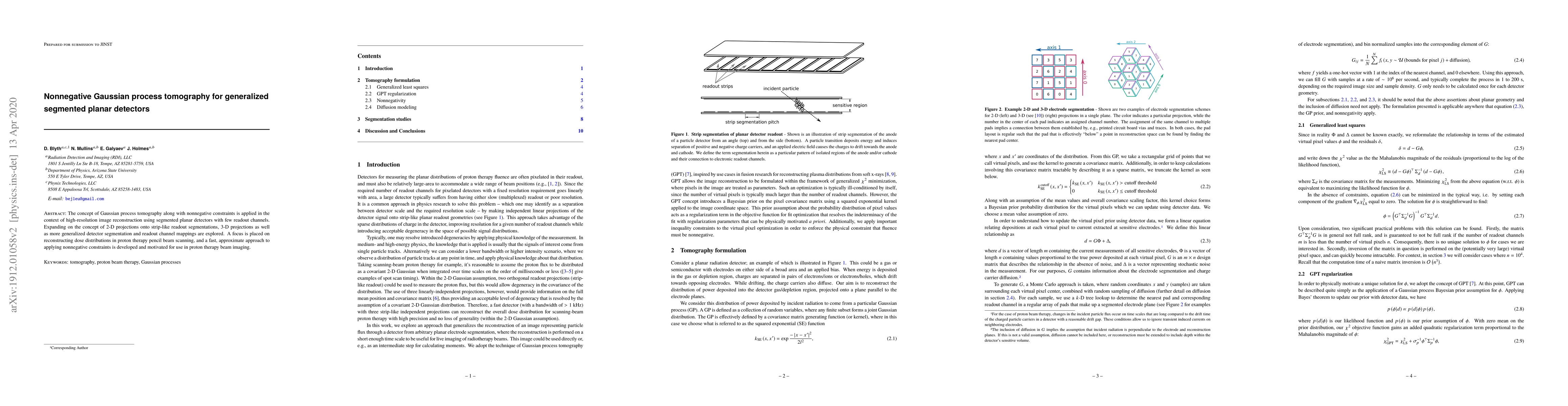 The concept of Gaussian process tomography along with nonnegative constraints is applied in the context of high-resolution image reconstruction using segmented planar detectors with few readout channels.Expanding on the concept of 2-D projections onto strip-like readout segmentations, 3-D projections as well as more generalized detector segmentation and readout channel mappings are explored. A focus is placed on reconstructing dose distributions in proton therapy pencil beam scanning, and a fast, approximate approach to applying nonnegative constraints is developed and motivated for use in proton therapy beam imaging.