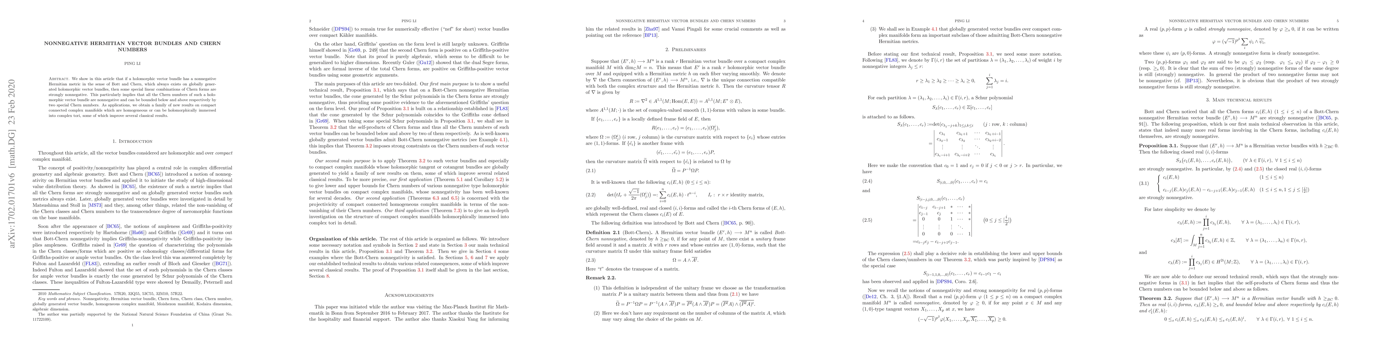 We show in this article that if a holomorphic vector bundle has a nonnegative Hermitian metric in the sense of Bott and Chern, which always exists on globally generated holomorphic vector bundles, then some special linear combinations of Chern forms are strongly nonnegative. This particularly implies that all the Chern numbers of such a holomorphic vector bundle are nonnegative and can be bounded below and above respectively by two special Chern numbers. As applications, we obtain a family of new results on compact connected complex manifolds which are homogeneous or can be holomorphically immersed into complex tori, some of which improve several classical results.
